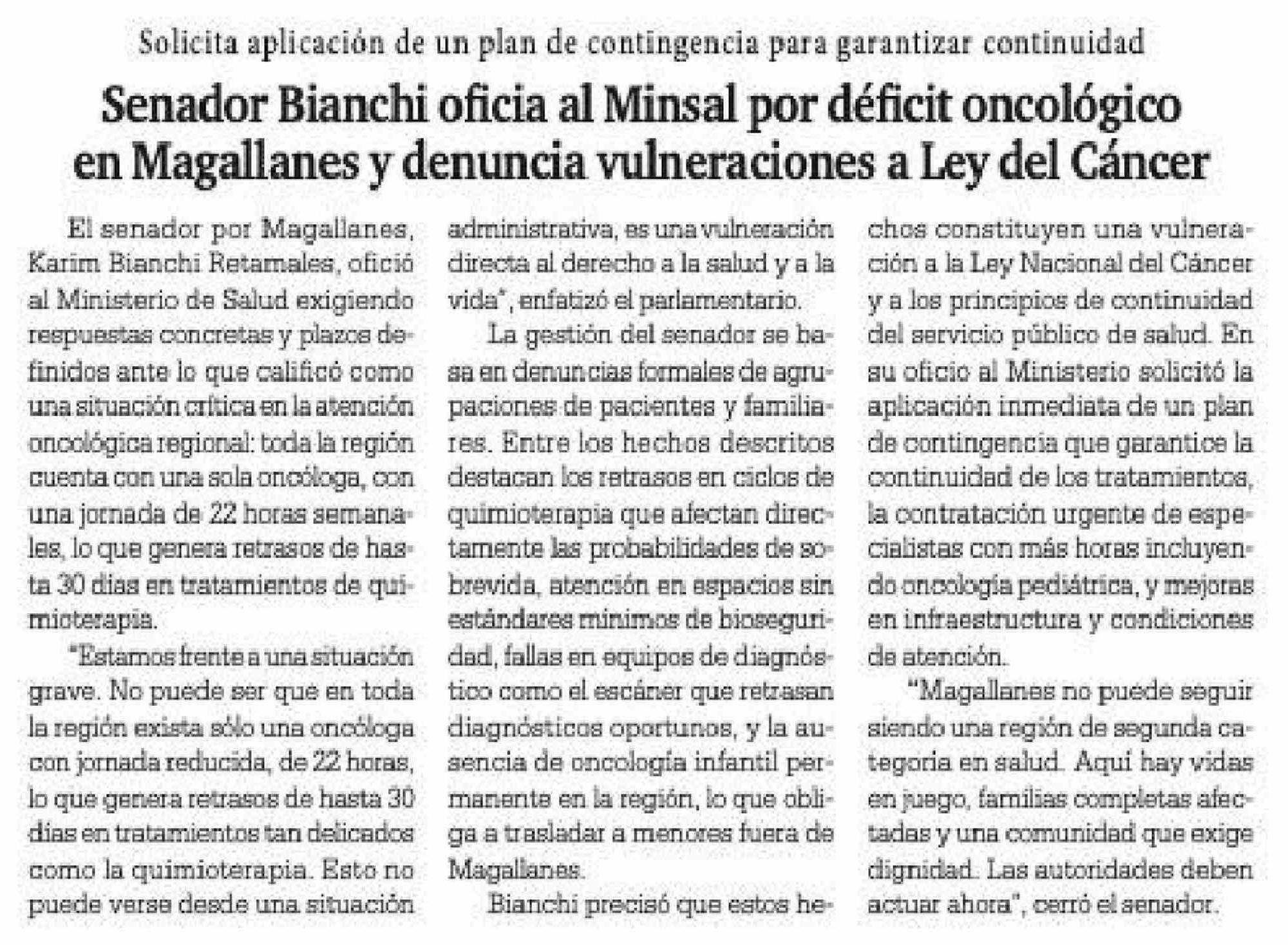 | Título: | Senador Bianchi oficia al Minsal por déficit oncológico en Magallanes y denuncia vulneraciones a Ley del Cáncer |