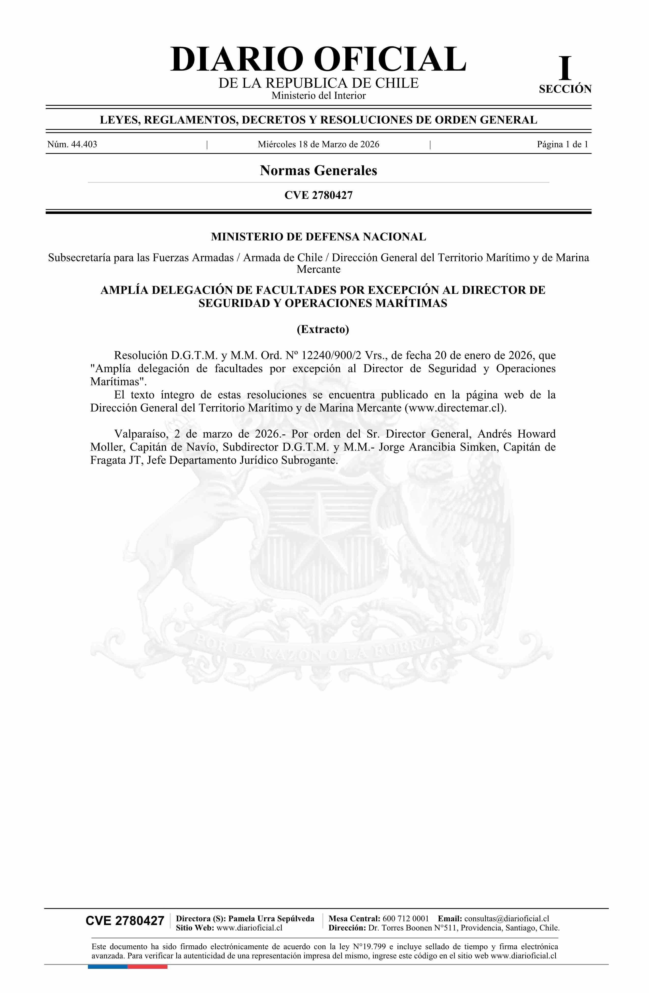 Título: Extracto de resolución número 12240/900/2 Vrs., de 2026.- Amplía delegación de facultades por excepción al Director de Seguridad y Operaciones Marítimas