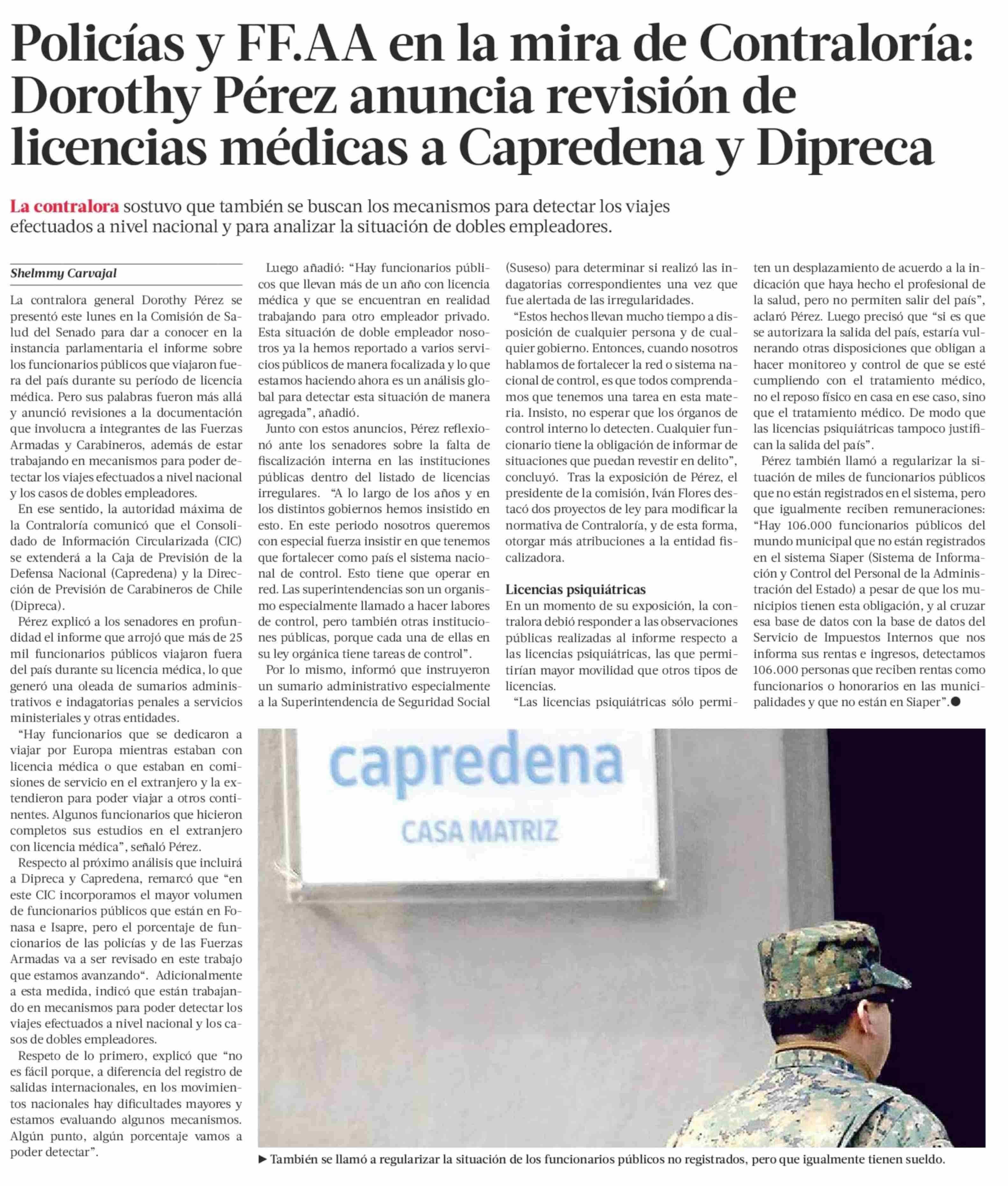 Policías y FF.AA en la mira de Contraloría: Dorothy Pérez anuncia revisión de licencias médicas a Capredena y Dipreca 27-05-2025 La Tercera |