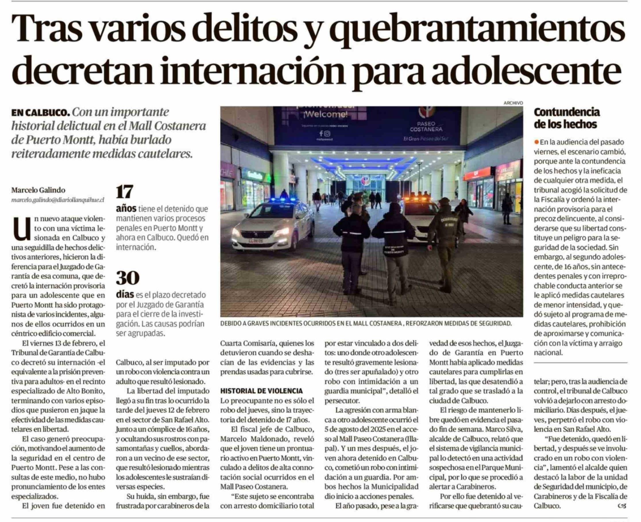 Tras varios delitos y quebrantamientos decretan internación para adolescente 15-02-2026 El Llanquihue |