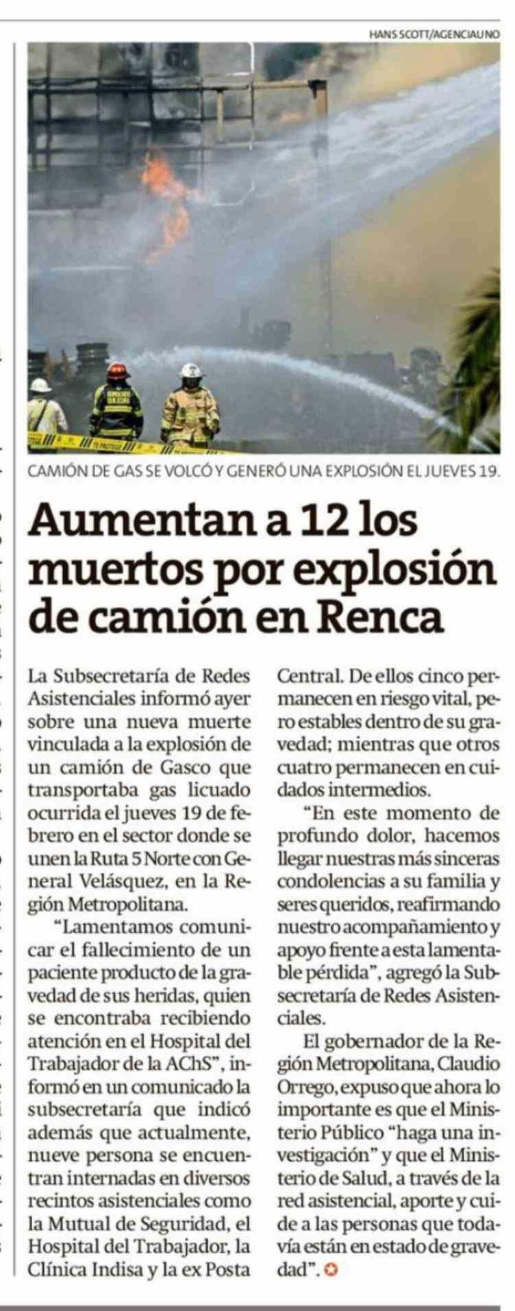 Aumentan a 12 los muertos por explosión de camión en Renca 26-02-2026 La Estrella de Chiloé |