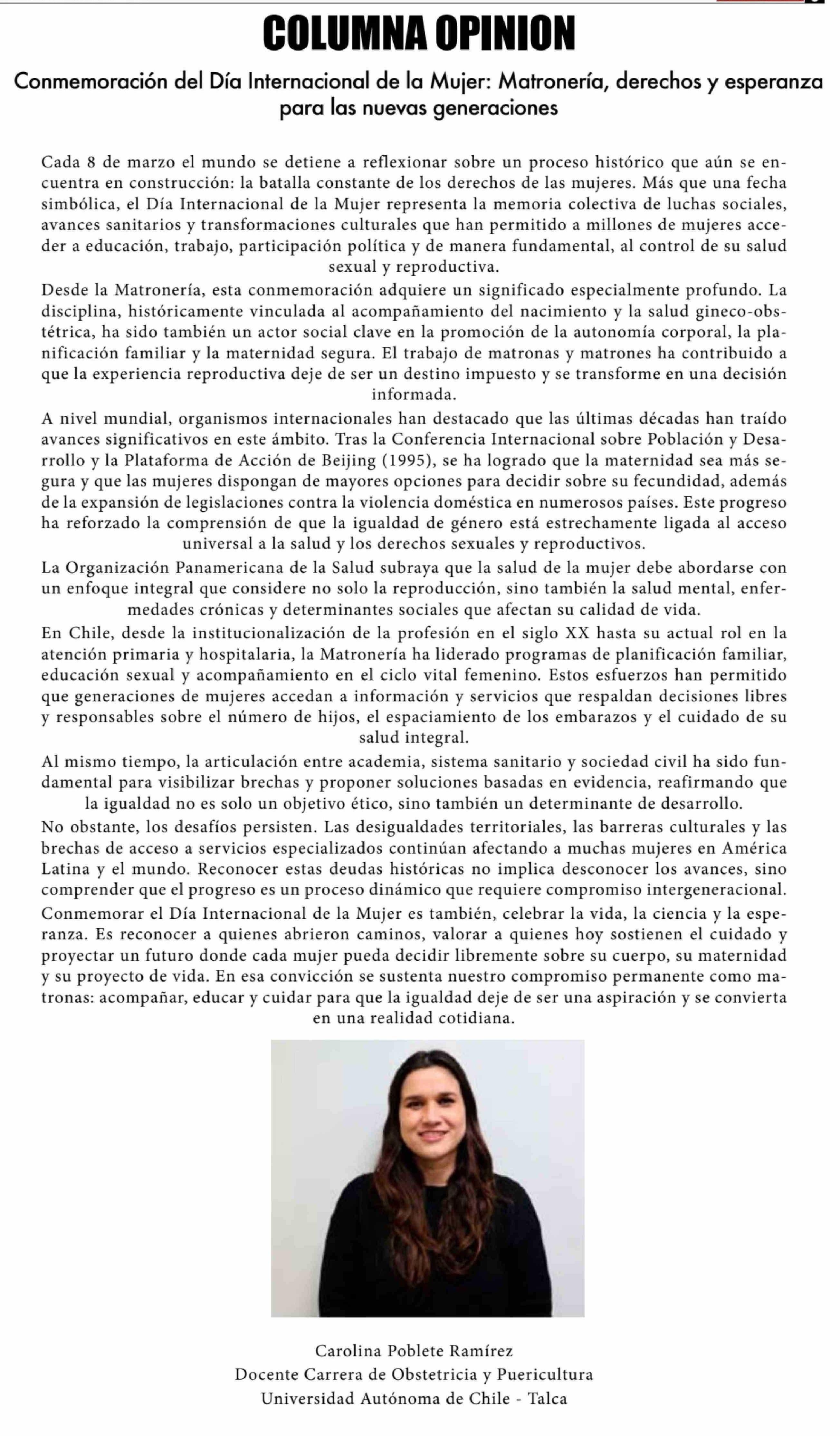 Columnas de Opinión: Conmemoración del Día Internacional de la Mujer: Matronería, derechos y esperanza para las nuevas generaciones 05-03-2026 El Lector |