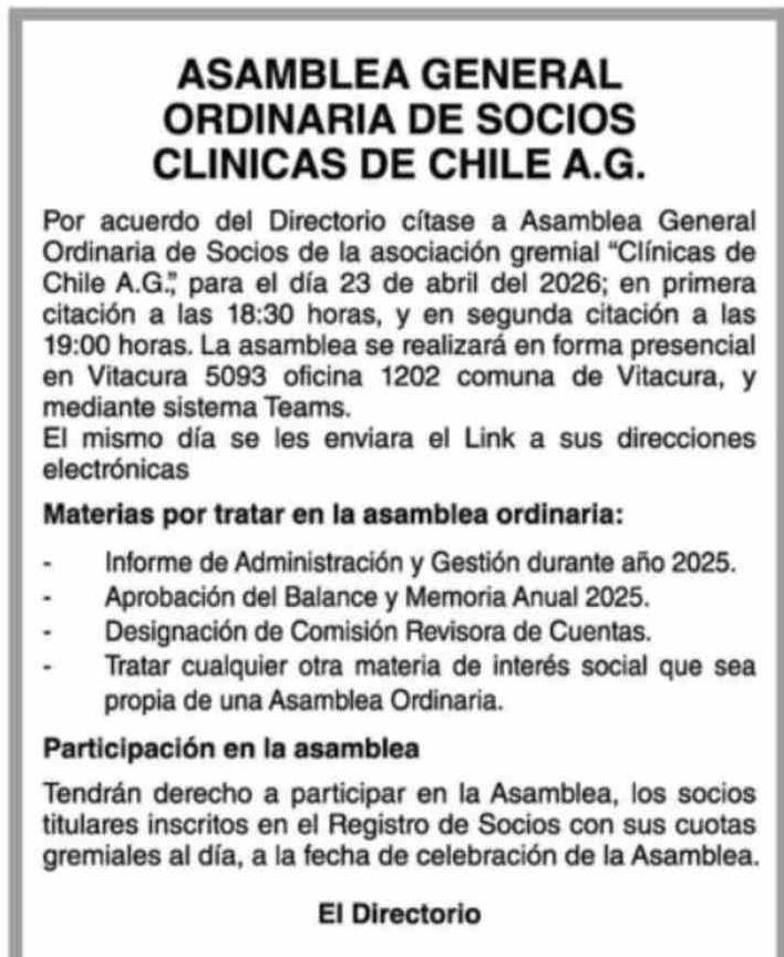 Extractos: ASAMBLEA GENERAL ORDINARIA DE SOCIOS CLINICAS DE CHILE A.G. Por acuerdo del Directorio cítase a Asamblea General Ordinaria de Socios de la asociación gremial "Clínicas de Chile A.G.", para el día 23 de abril del 2026; en primera citación a las 18:30 horas, y en segunda citación a las 19:0