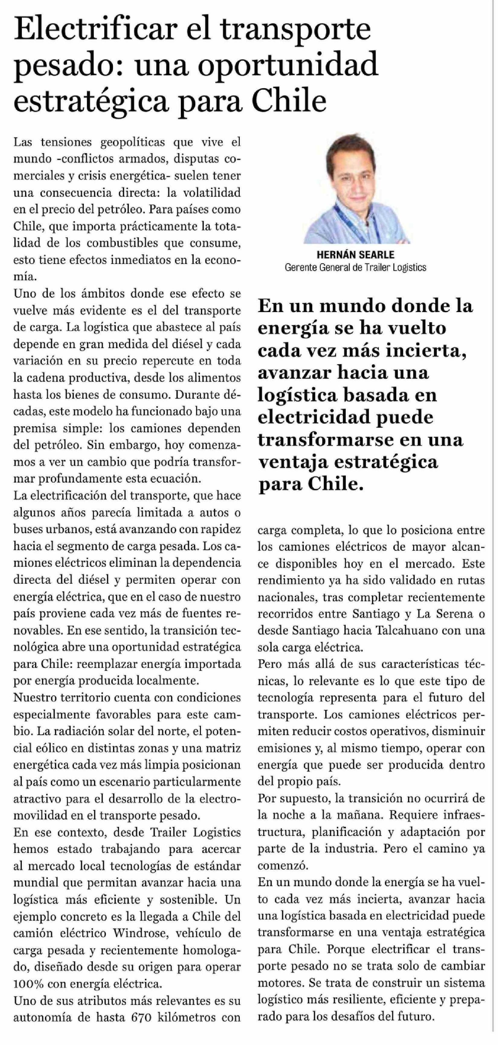 Título: Columnas de Opinión: Electrificar el transporte pesado: una oportunidad estratégica para Chile