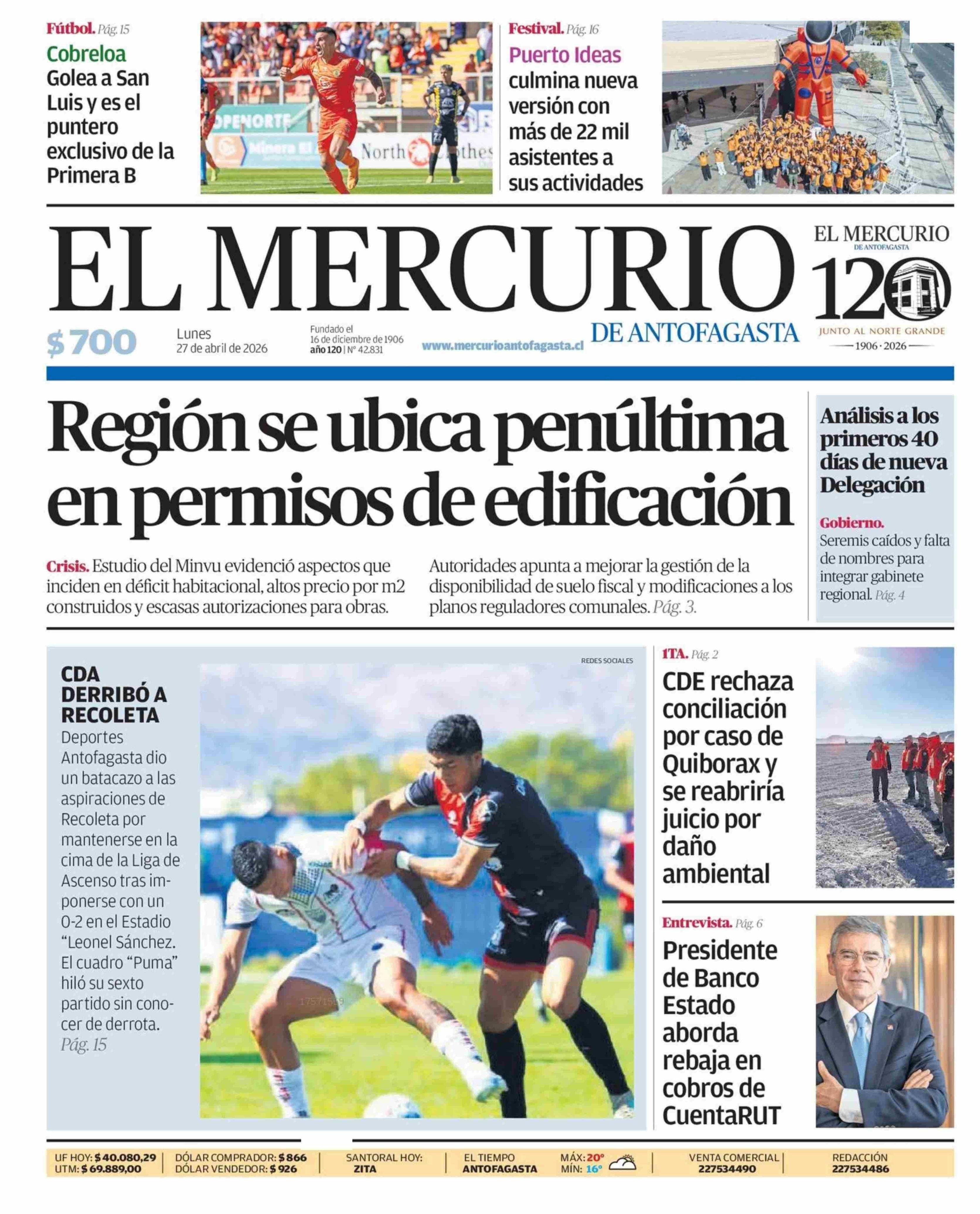 PORTADA EL MERCURIO DE ANTOFAGASTA - CHILE 27-04-2026 El Mercurio de Antofagasta |
