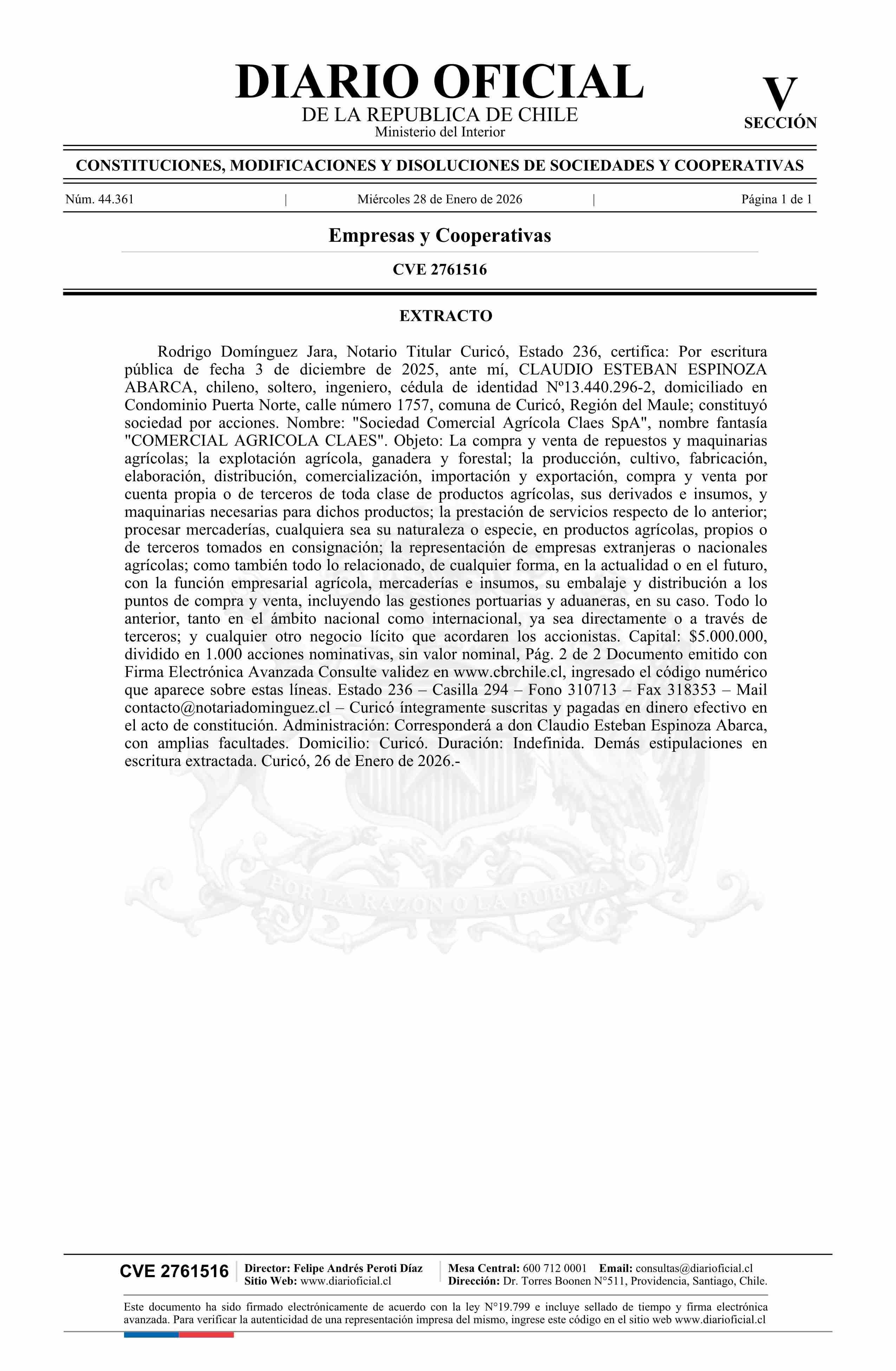 Sociedad Comercial Agrícola Claes SpA 28-01-2026 Diario Oficial Edición Electrónica |