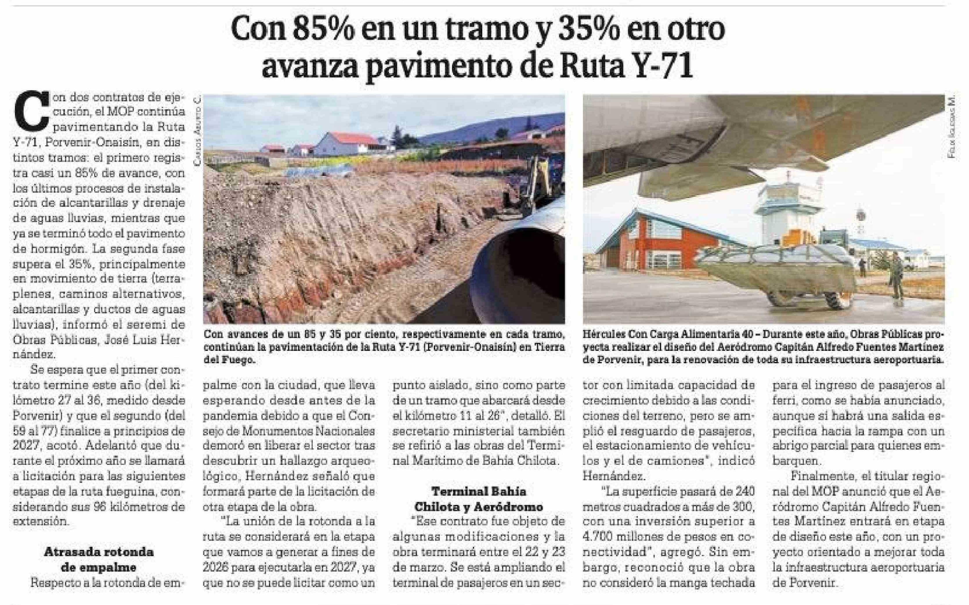 Con 85% en un tramo y 35% en otro avanza pavimento de Ruta Y-71 03-03-2026 La Prensa Austral |