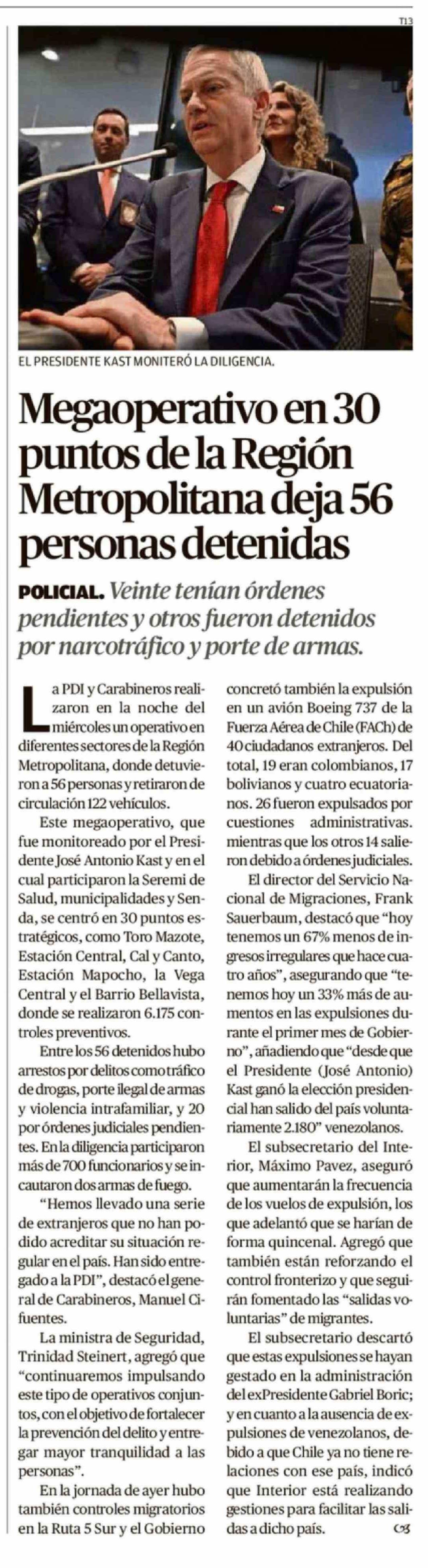 | Título: | Megaoperativo en 30 puntos de la Región Metropolitana deja 56 personas detenidas |