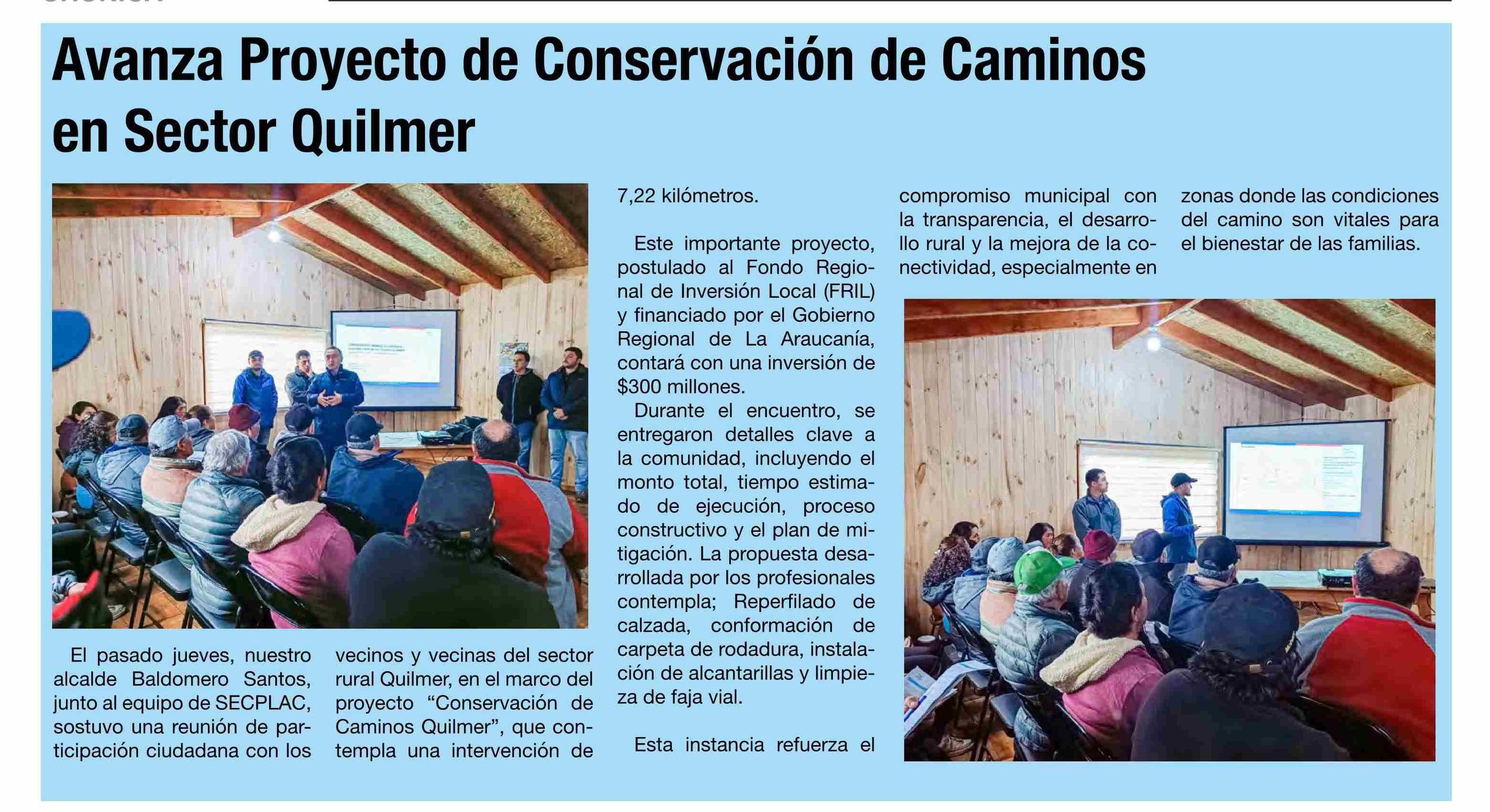 | Título: | Avanza Proyecto de Conservación de Caminos en Sector Quilmer |
