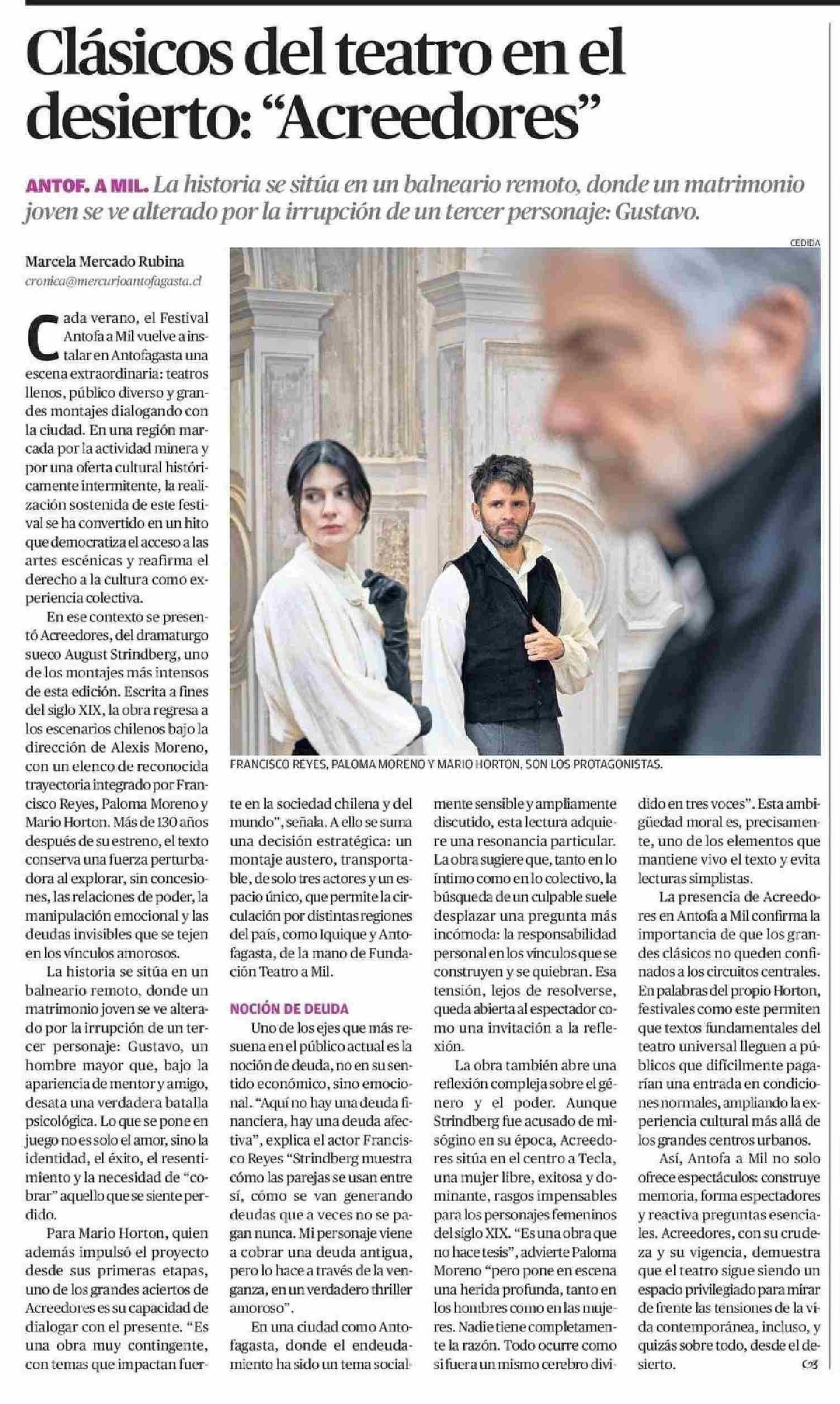 Clásicos del teatro en el desierto: "Acreedores" 14-01-2026 El Mercurio de Antofagasta |