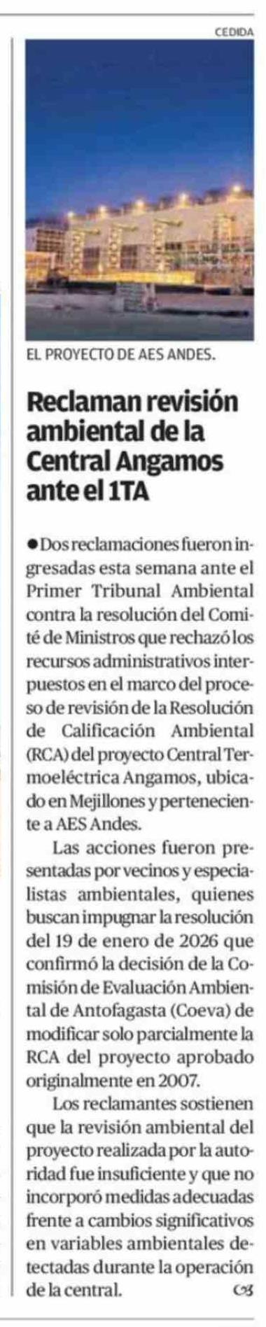 Reclaman revisión ambiental de la Central Angamos ante el 1TA 05-03-2026 El Mercurio de Calama |