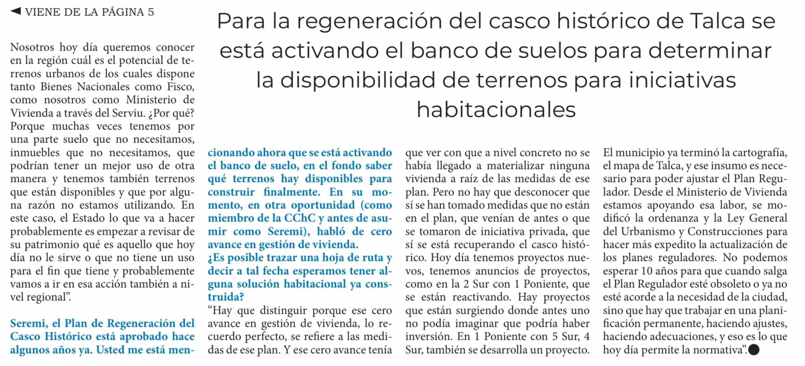 | Título: | Para la regeneración del casco histórico de Talca se está activando el banco de suelos para determinar la disponibilidad de terrenos para iniciativas habitacionales |