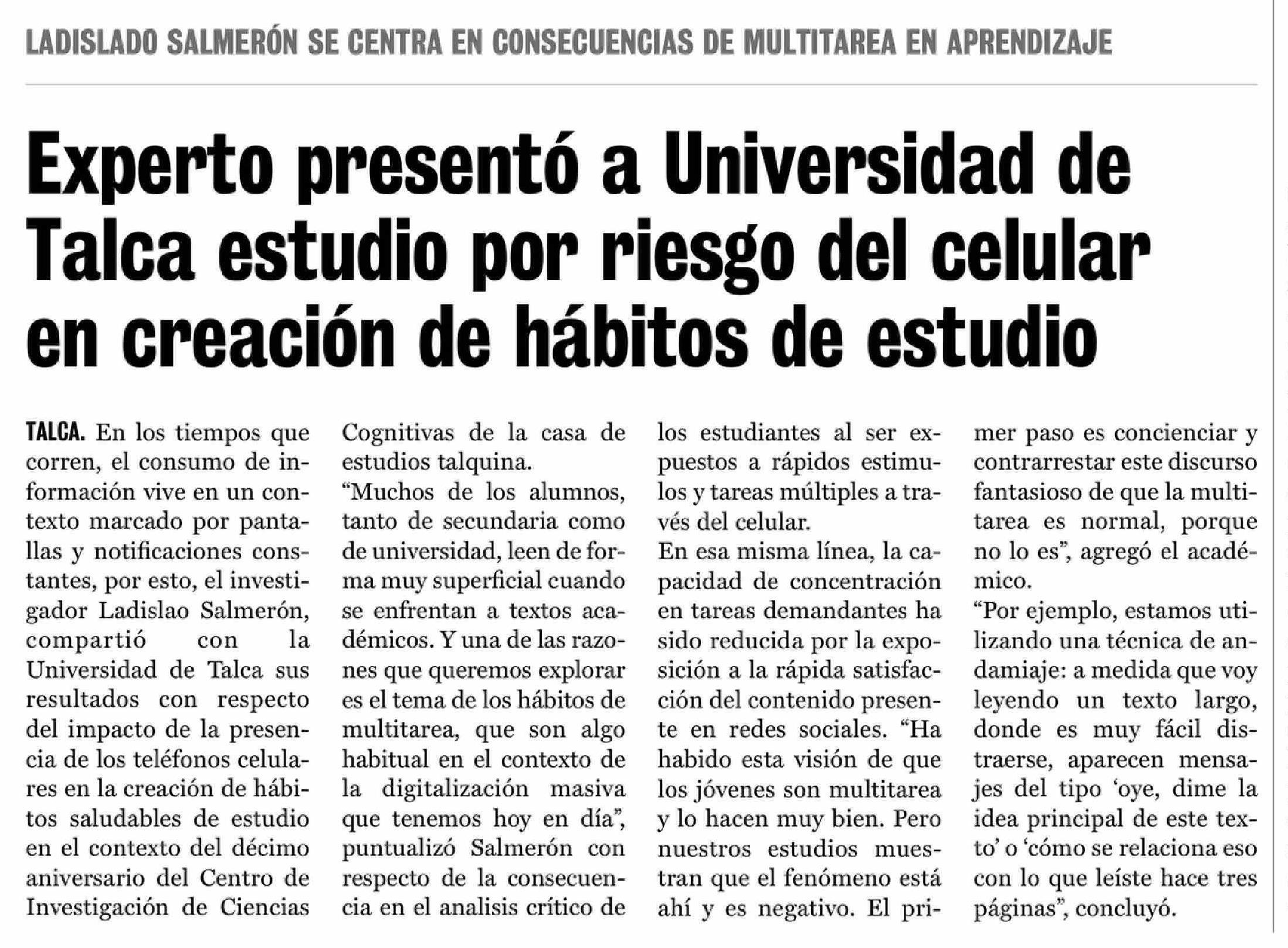 | Título: | Experto presentó a Universidad de Talca estudio por riesgo del celular en creación de hábitos de estudio |