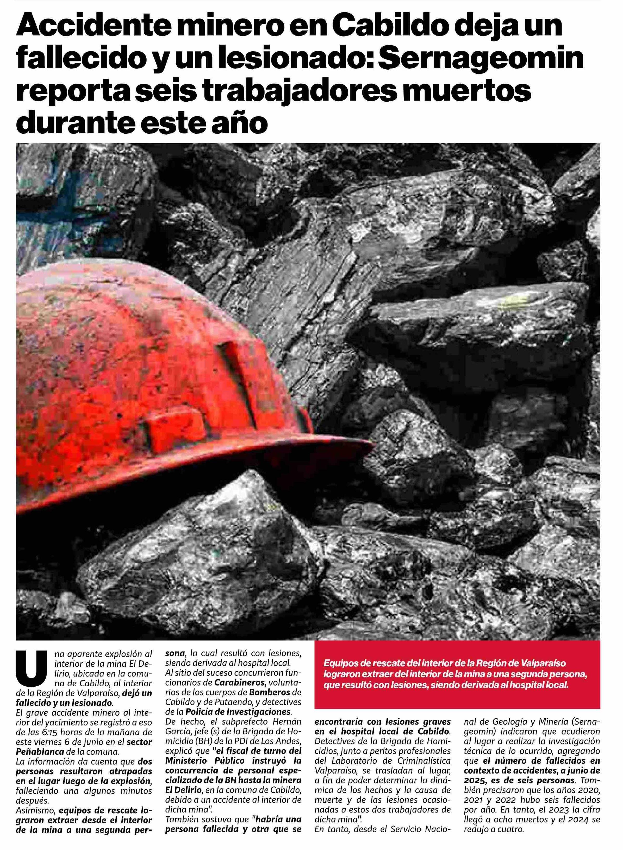 | Título: | Accidente minero en Cabildo deja un fallecido y un lesionado: Sernageomin reporta seis trabajadores muertos durante este año |