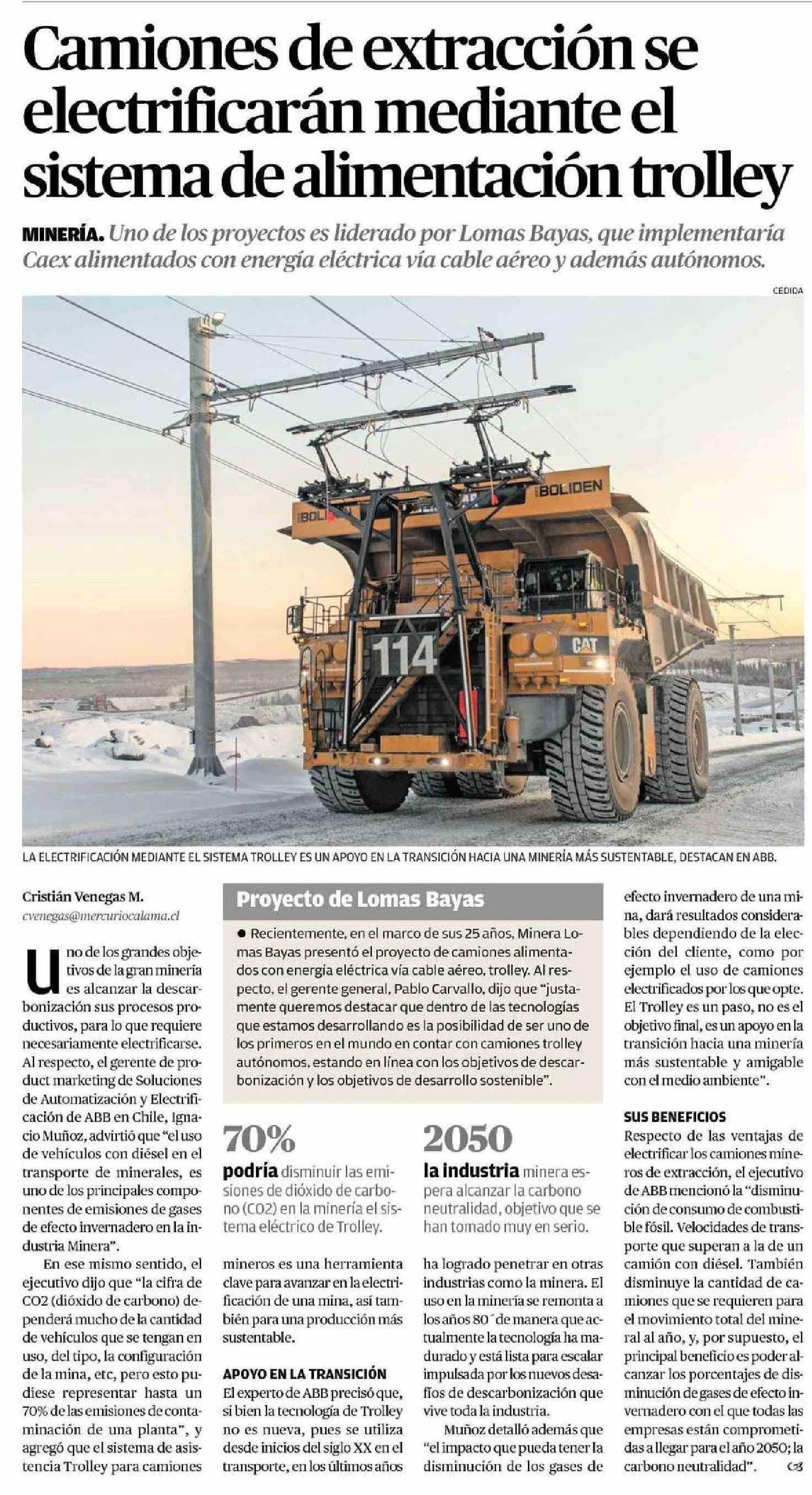 Camiones de extracción se electrificarán mediante el sistema de alimentación trolley 09-09-2023 El Mercurio de Antofagasta |