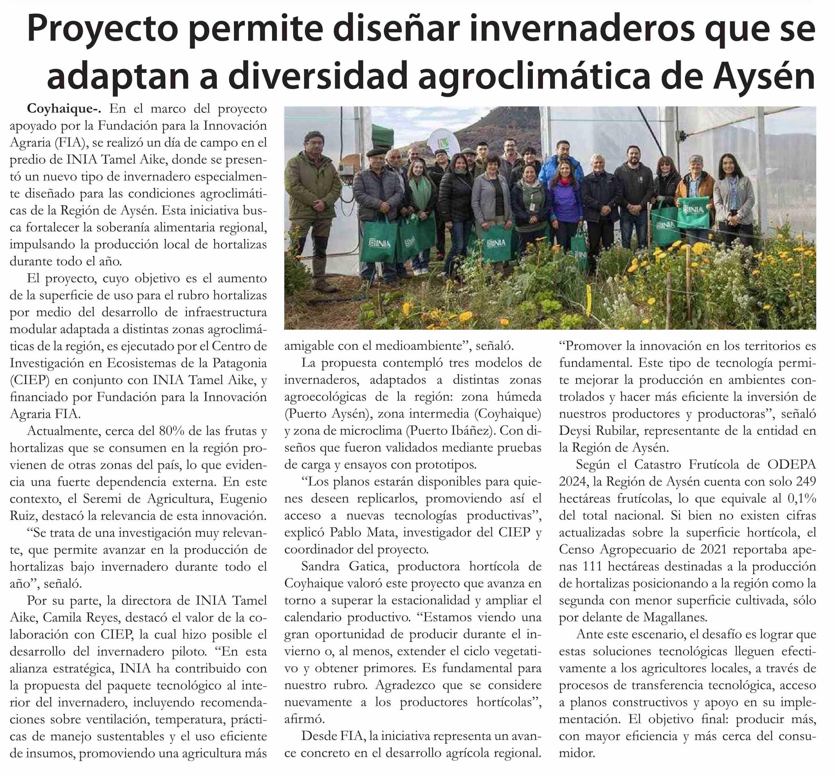 Proyecto permite diseñar invernaderos que se adaptan a diversidad agroclimática de Aysén 09-05-2025 El Divisadero |