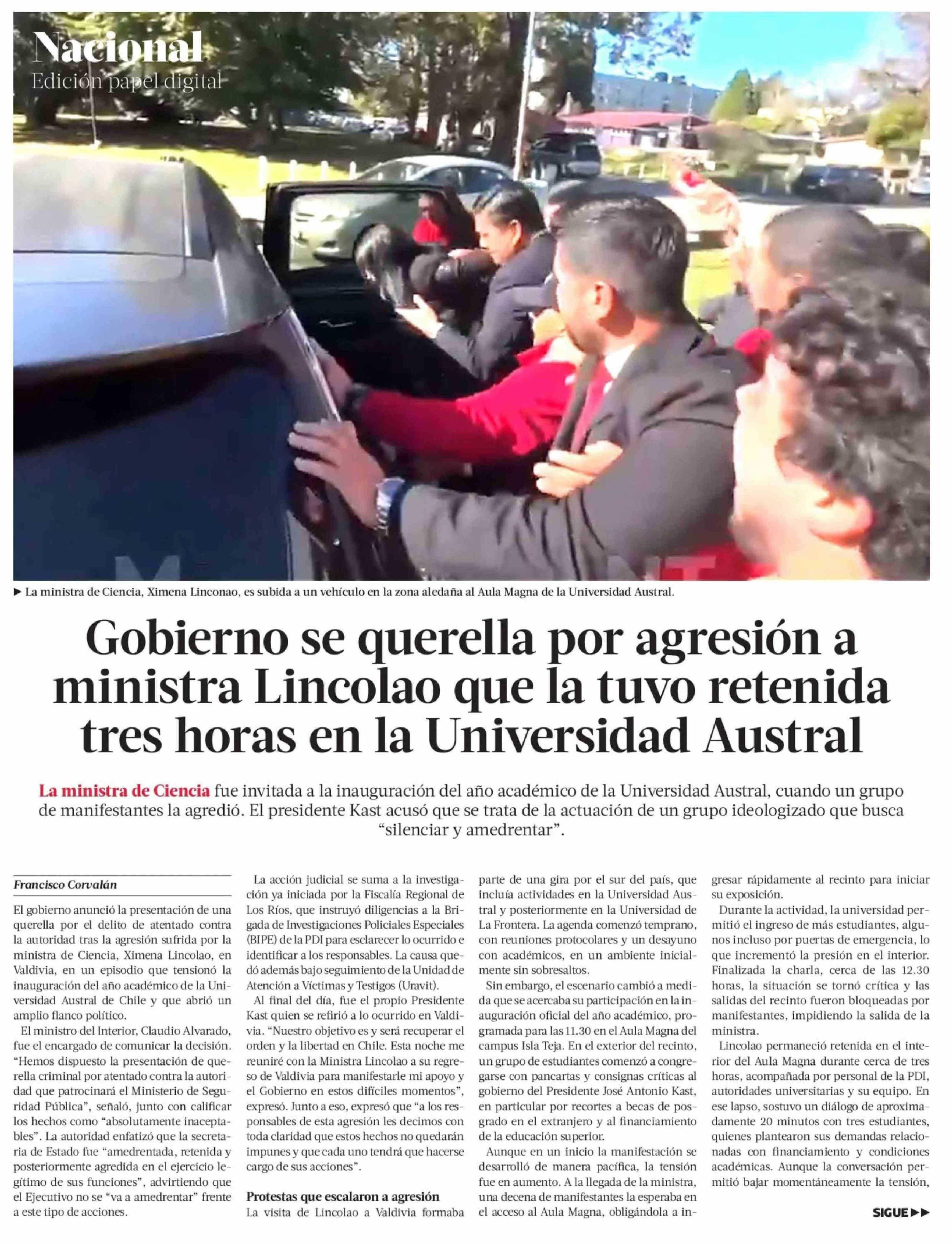 Gobierno se querella por agresión a ministra Lincolao que la tuvo retenida tres horas en la Universidad Austral 09-04-2026 La Tercera |