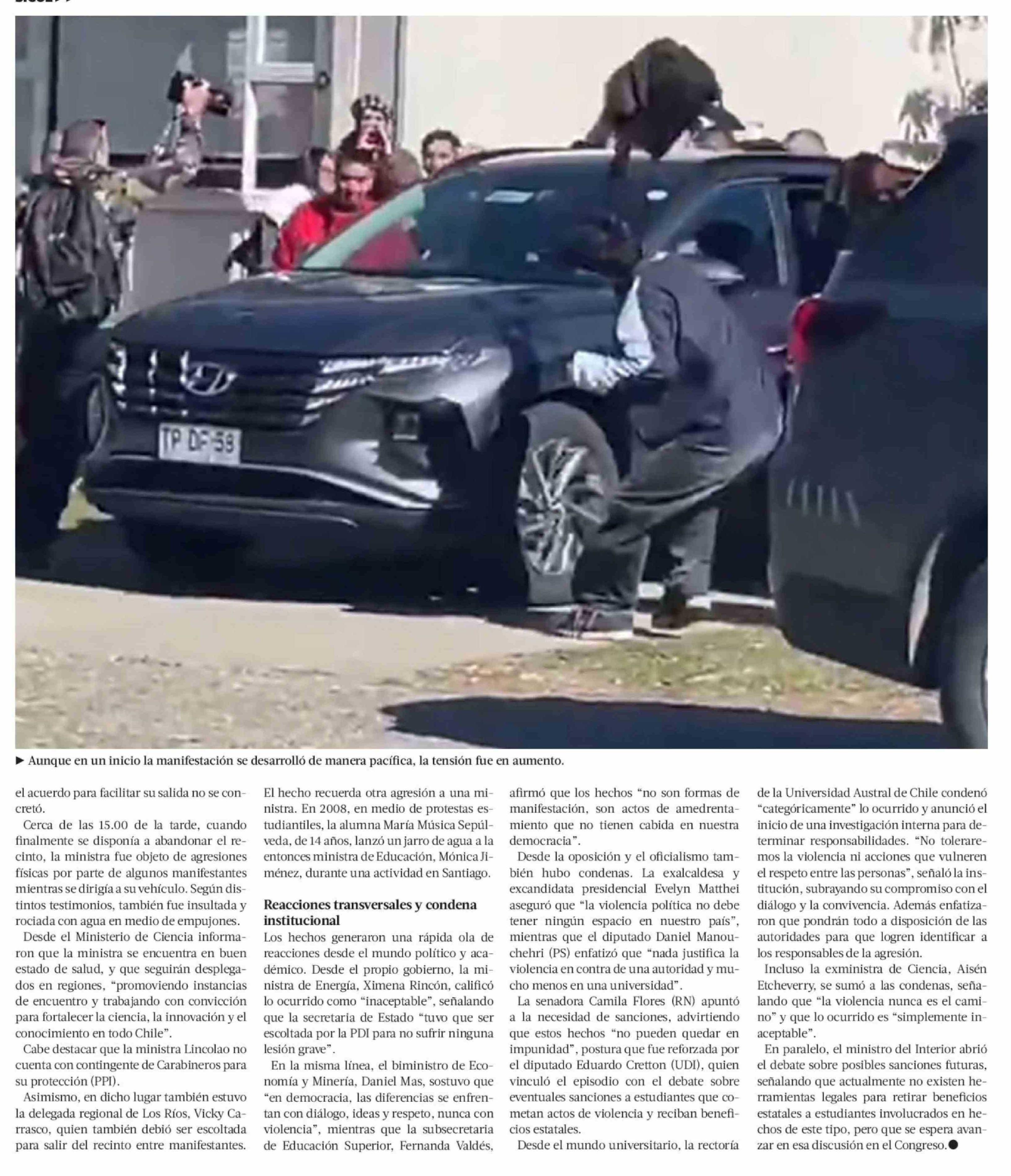 | Título: | Gobierno se querella por agresión a ministra Lincolao que la tuvo retenida tres horas en la Universidad Austral |