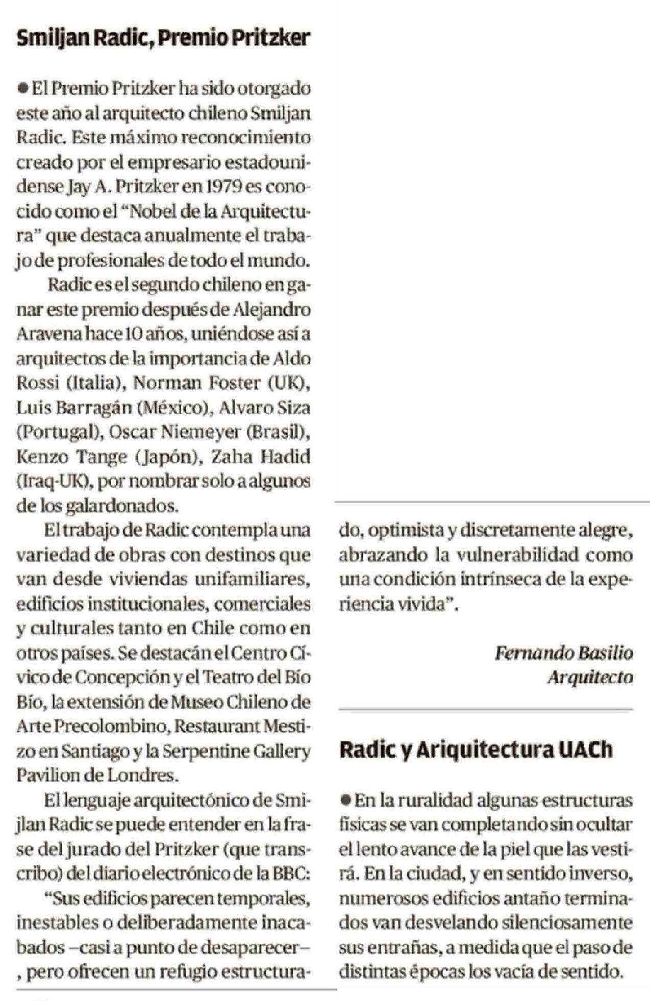 Título: CARTAS: Smiljan Radic, Premio Pritzker