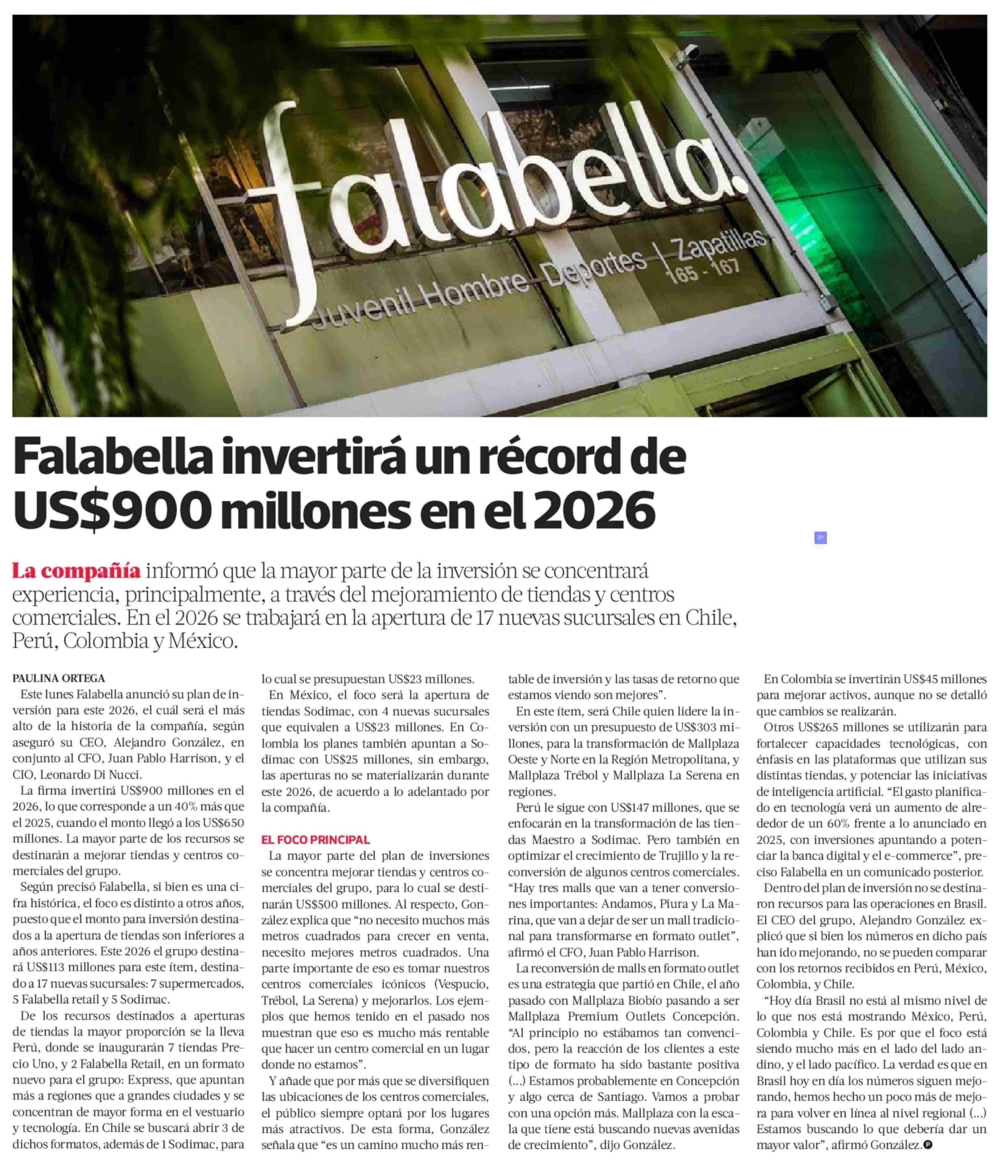 | Título: | Falabella invertirá un récord de US$900 millones en el 2026 |