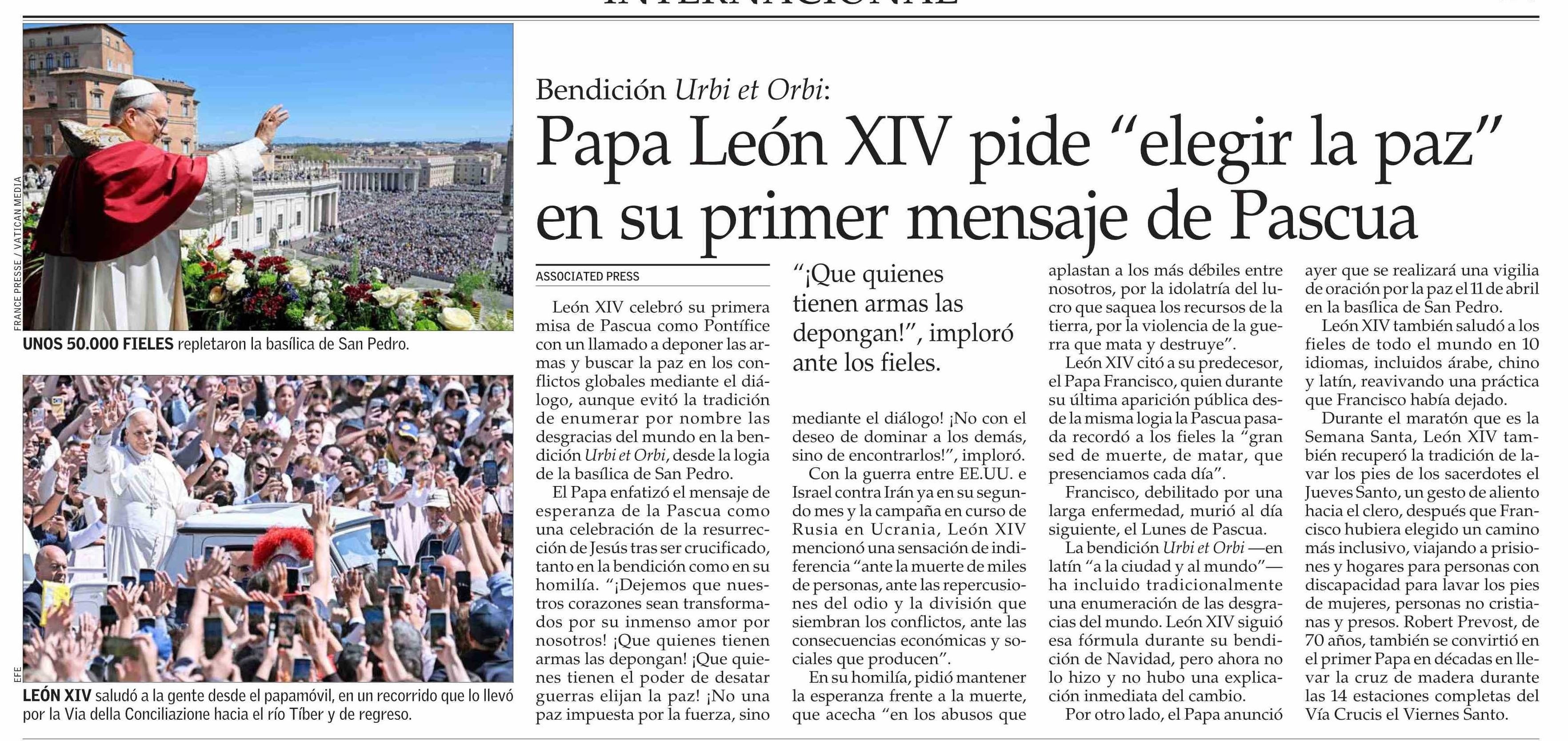 | Título: | Papa León XIV pide “elegir la paz” en su primer mensaje de Pascua |