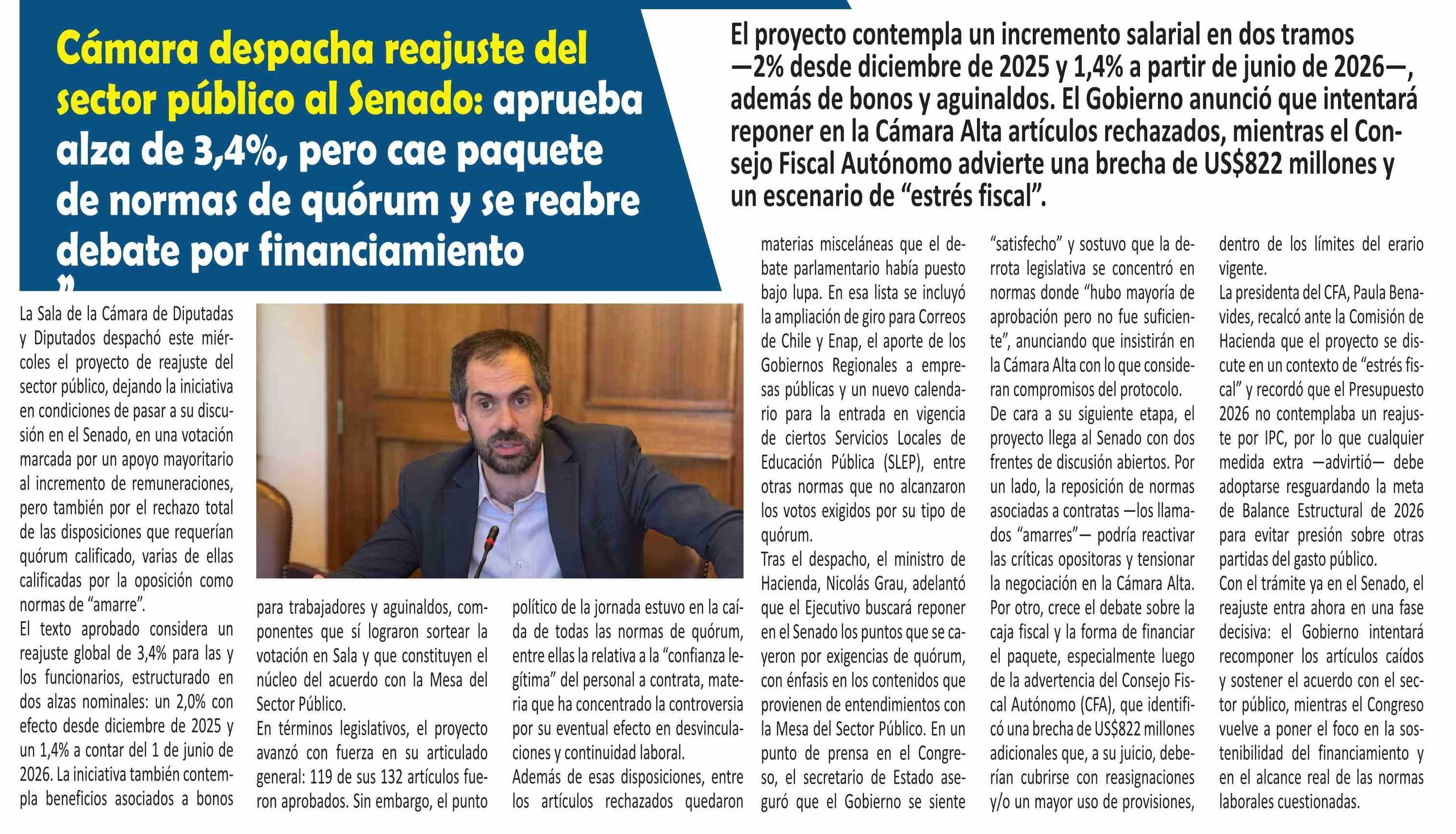Título: Cámara despacha reajuste del sector público al Senado: aprueba alza de 3,4%, pero cae paquete de normas de quórum y se reabre debate por financiamiento