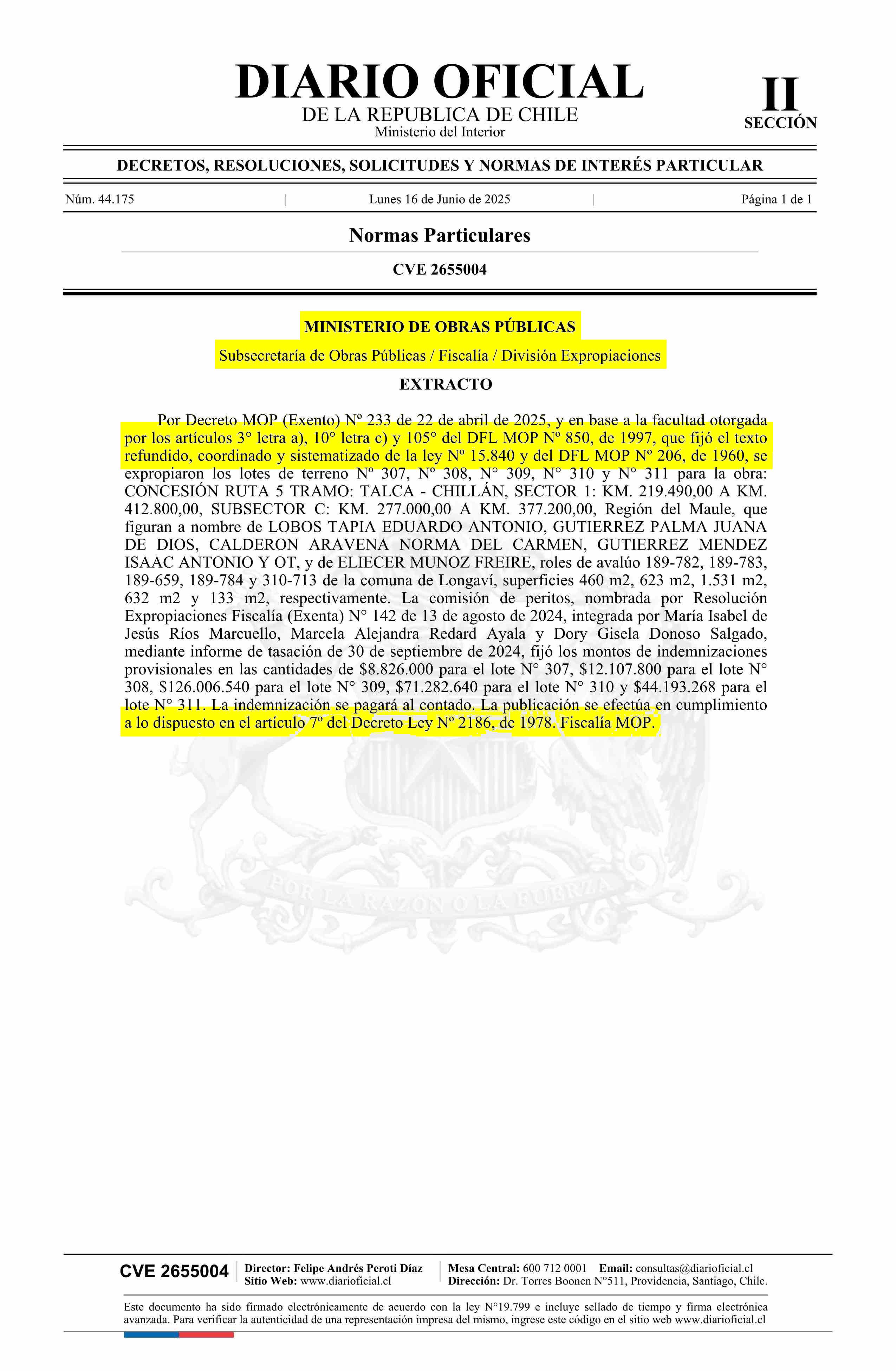 Extracto de decreto exento número 233, de 2025.- Lobos Tapia Eduardo Antonio y otros 16-06-2025 Diario Oficial Edición Electrónica |