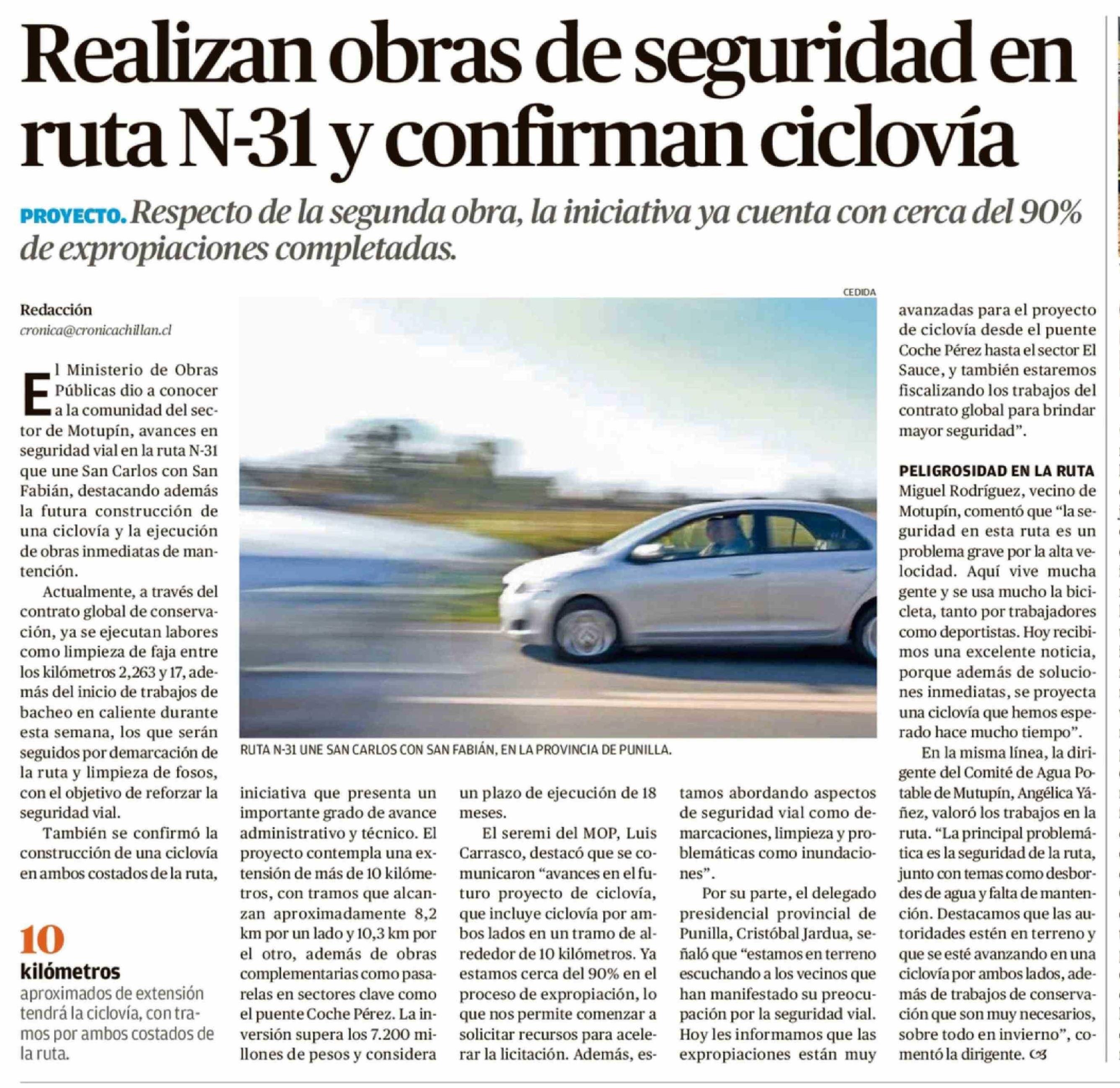 Realizan obras de seguridad en ruta N-31 y confirman ciclovía 14-04-2026 Crónica de Chillán |