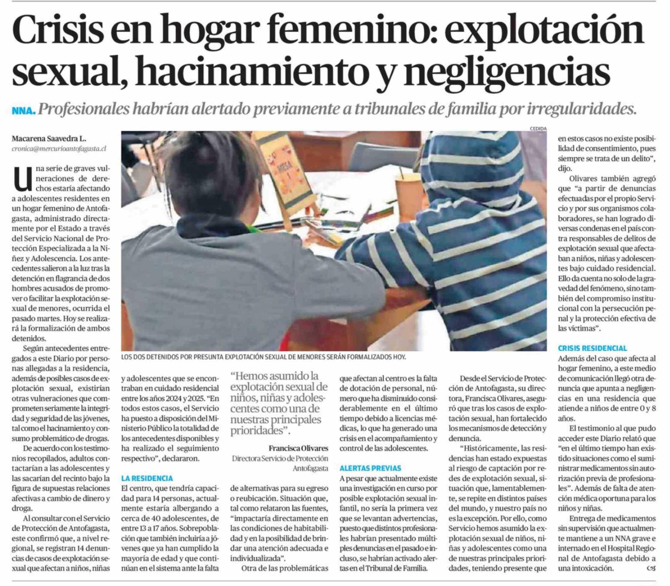 Crisis en hogar femenino: explotación sexual, hacinamiento y negligencias 14-02-2026 El Mercurio de Calama |