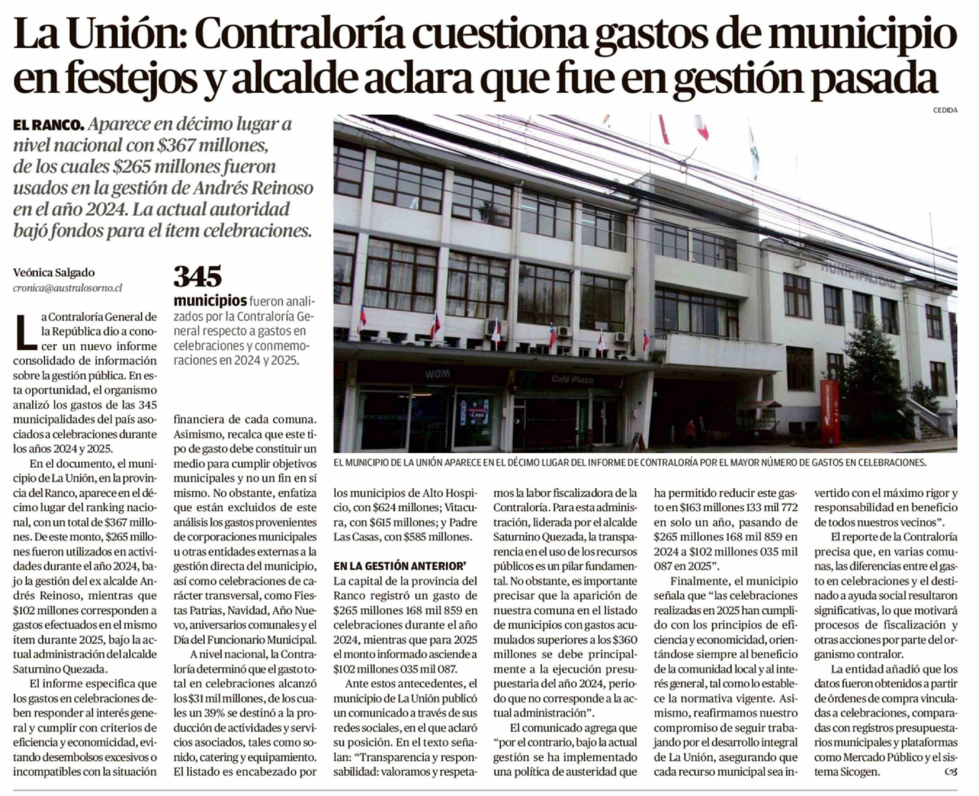 La Unión: Contraloría cuestiona gastos de municipio en festejos y alcalde aclara que fue en gestión pasada 08-04-2026 El Austral de Osorno |