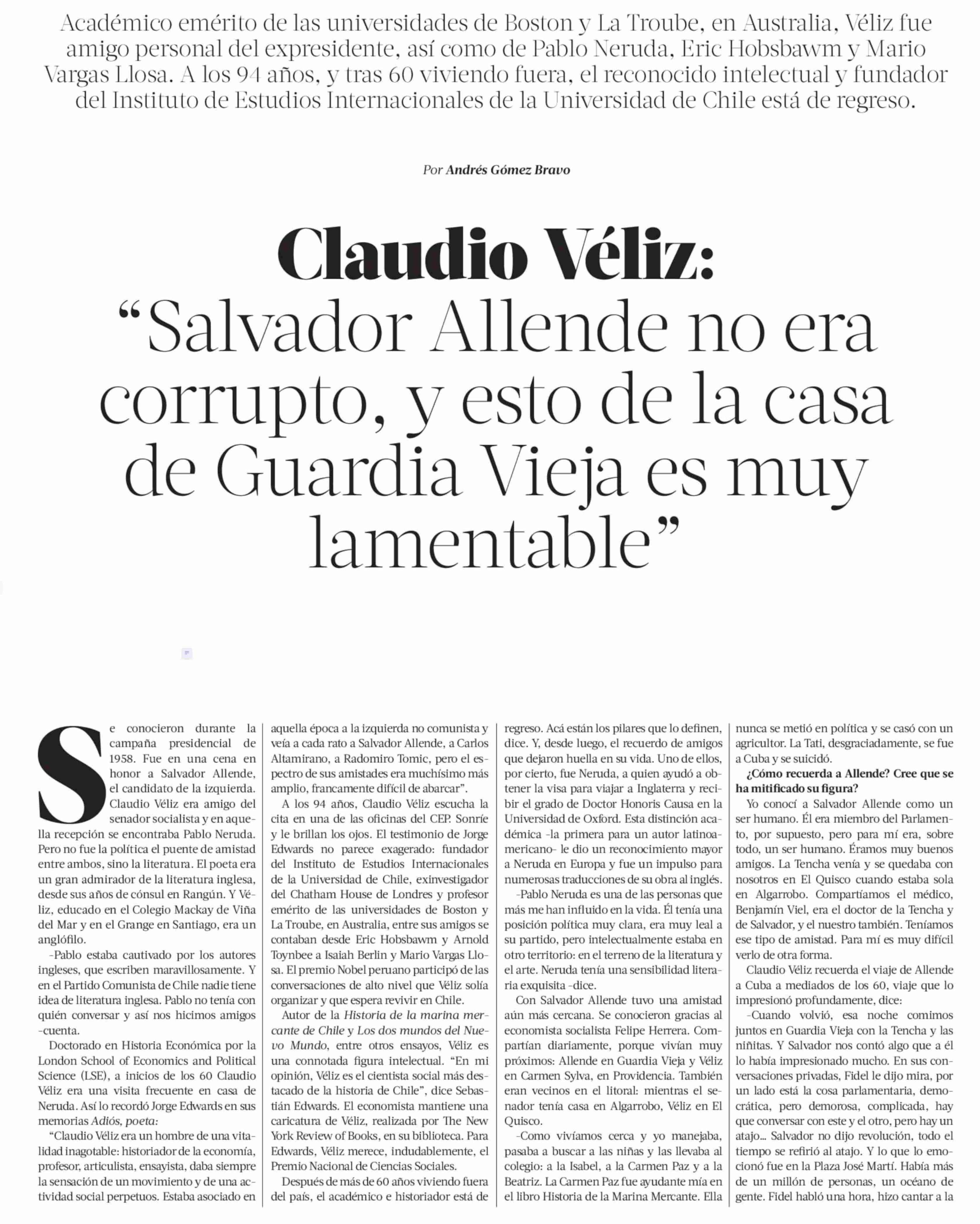Título: Claudio Véliz: “Salvador Allende no era corrupto, y esto de la casa de Guardia Vieja es muy lamentable”