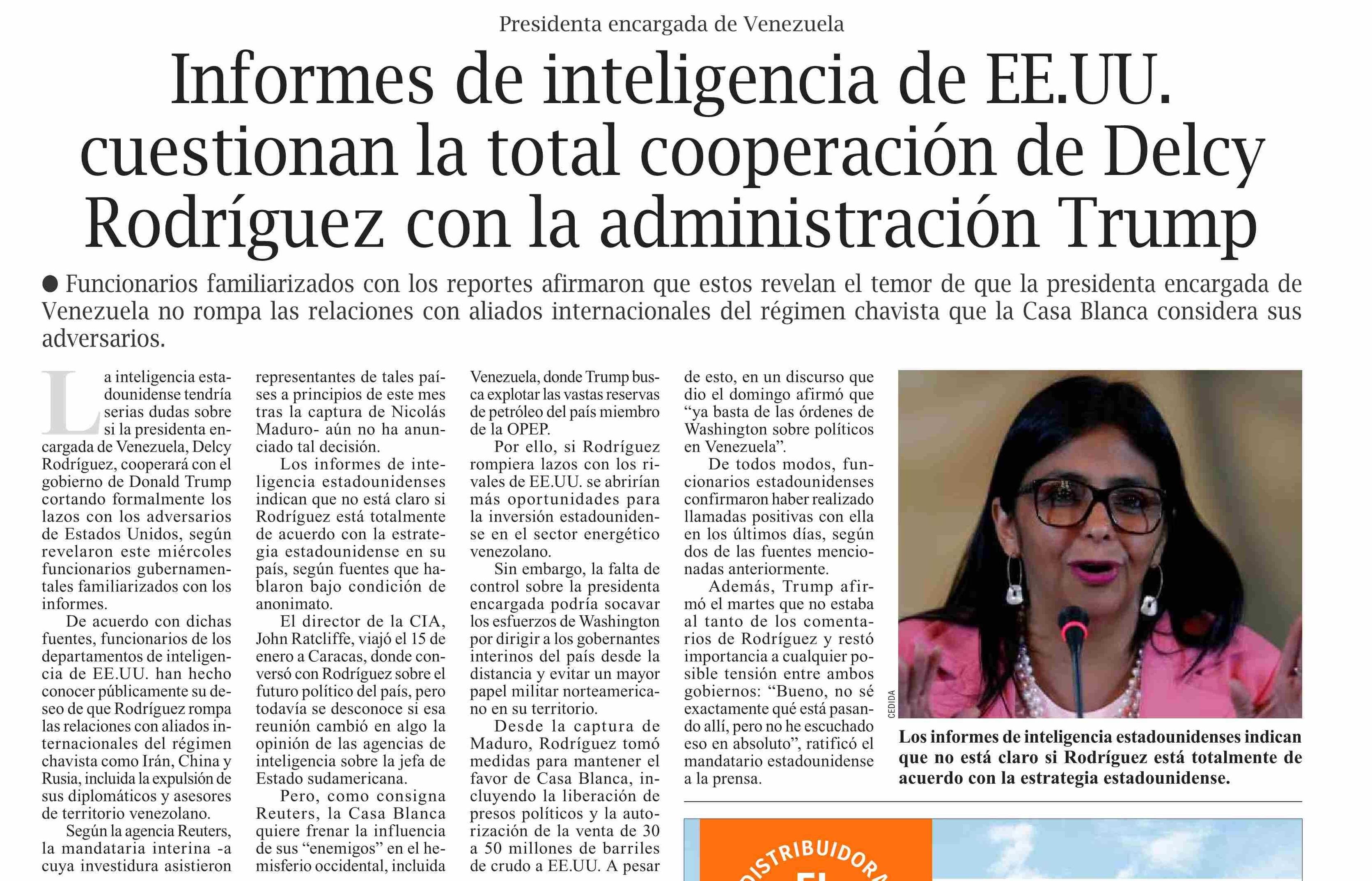| Título: | Informes de inteligencia de EE.UU. cuestionan la total cooperación de Delcy Rodríguez con la administración Trump |
