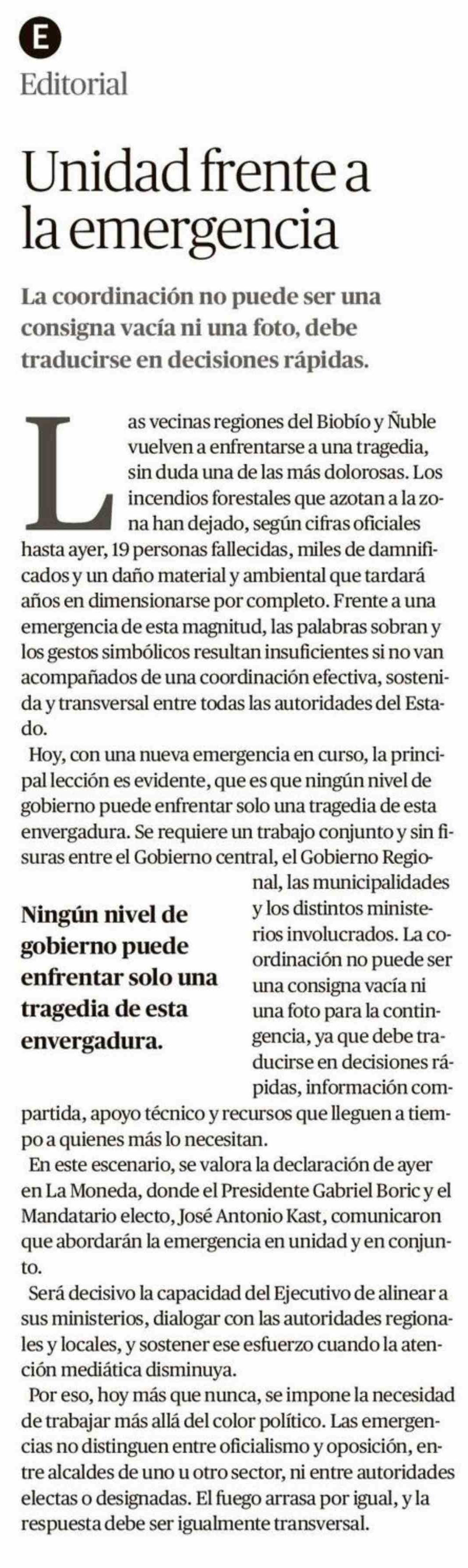 Editorial: Unidad frente a la emergencia 20-01-2026 El Austral de la Araucanía |