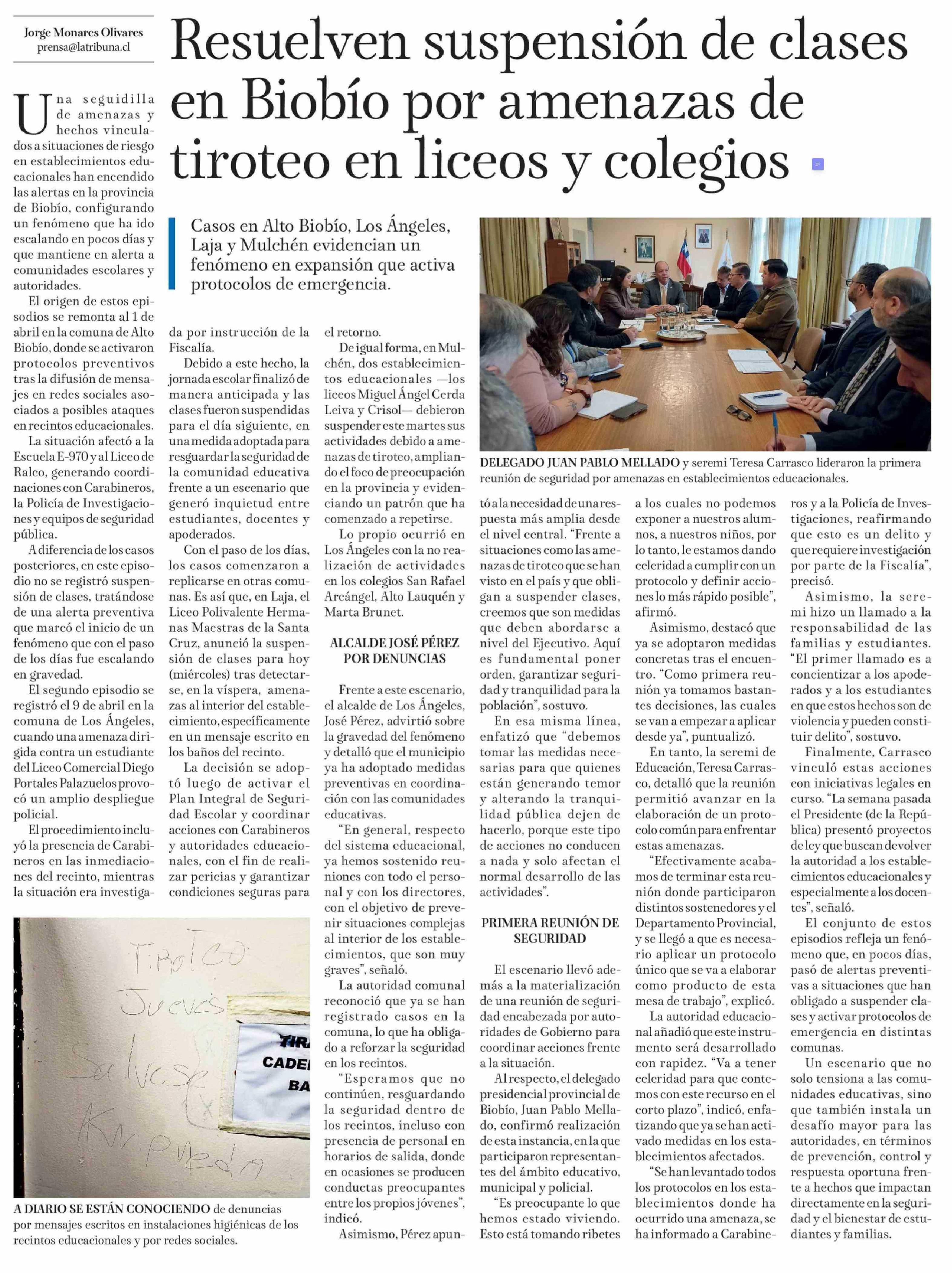 Resuelven suspensión de clases en Biobío por amenazas de tiroteo en liceos y colegios 15-04-2026 La Tribuna |