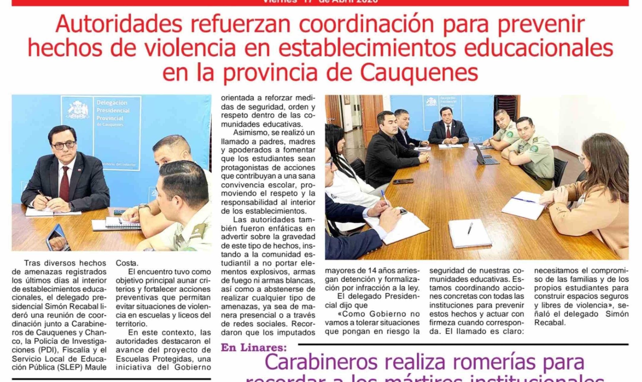 Autoridades refuerzan coordinación para prevenir hechos de violencia en establecimientos educacionales en la provincia de cauquenes 17-04-2026 Maule Hoy |