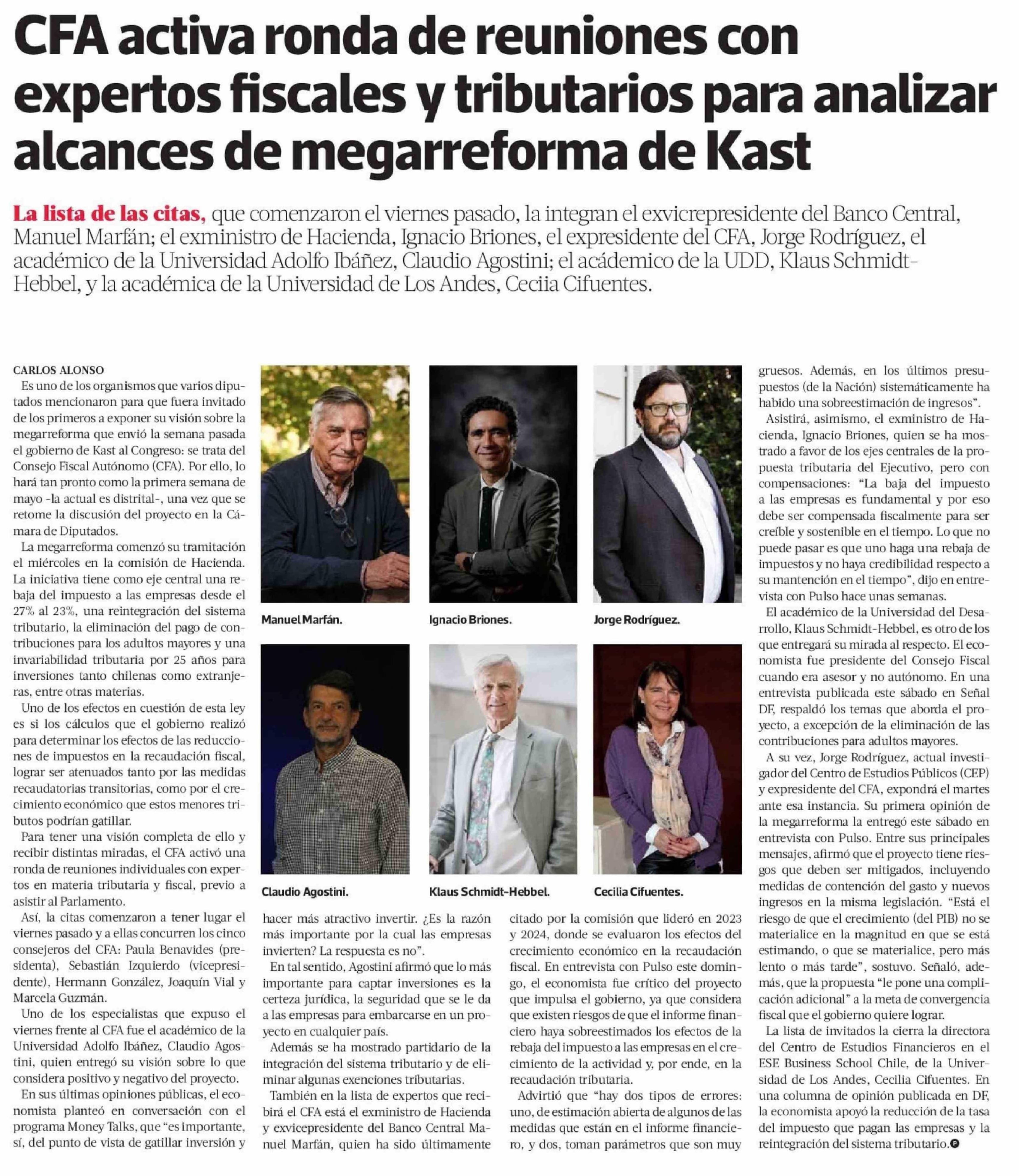 | Título: | CFA activa ronda de reuniones con expertos fiscales y tributarios para analizar alcances de megarreforma de Kast |