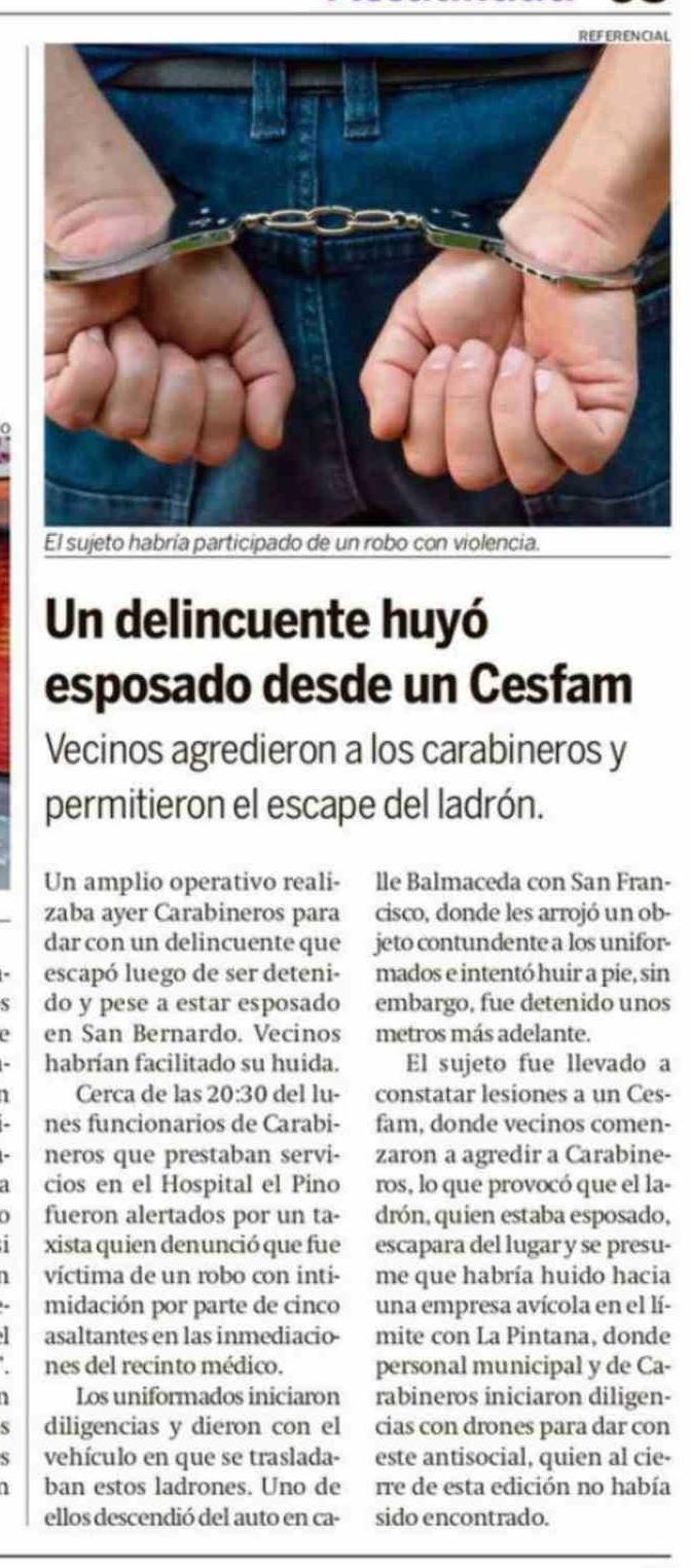 | Título: | Un delincuente huyó esposado desde un Cesfam |