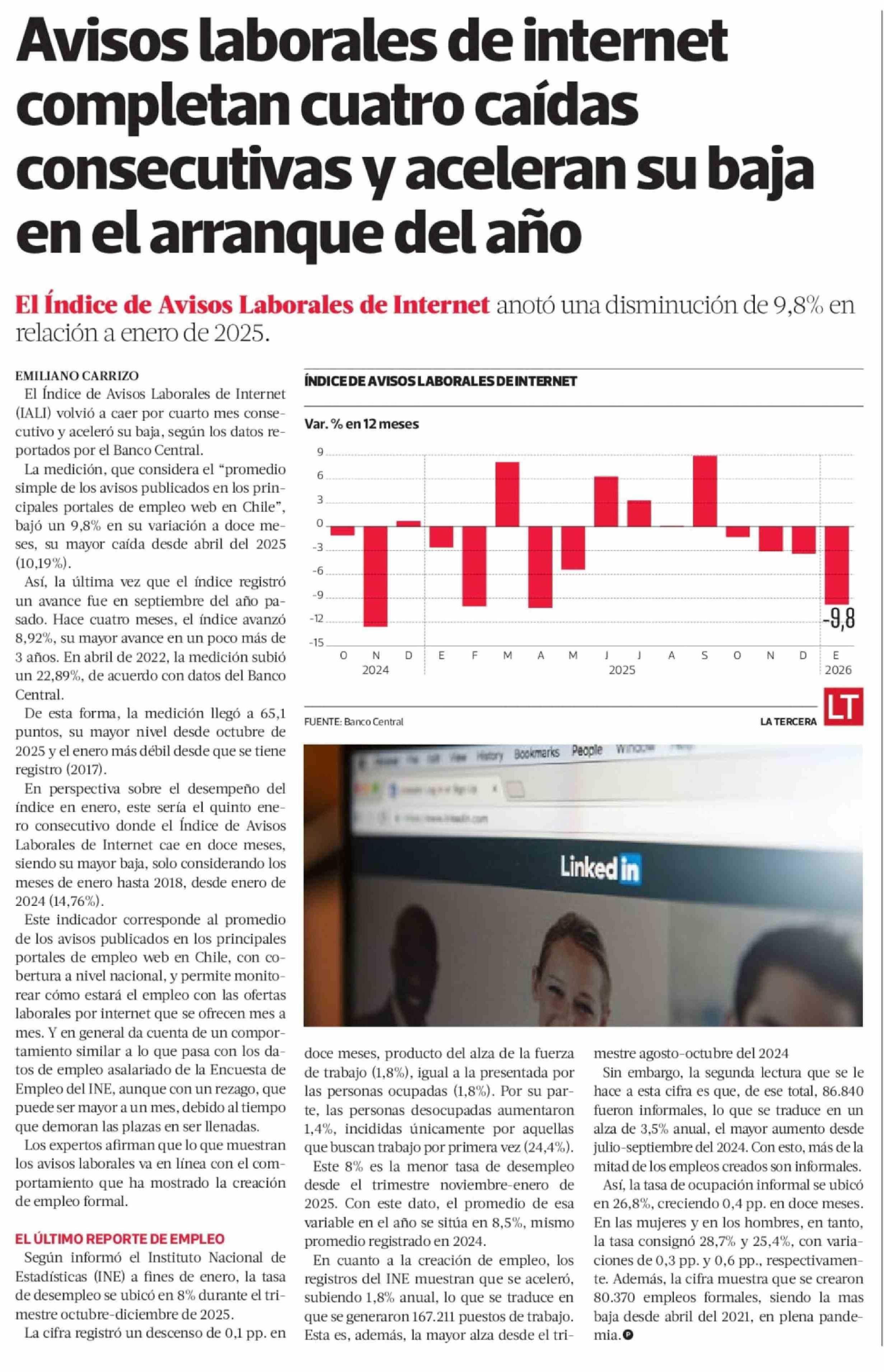 Avisos laborales de internet completan cuatro caídas consecutivas y aceleran su baja en el arranque del año 10-02-2026 La Tercera |
