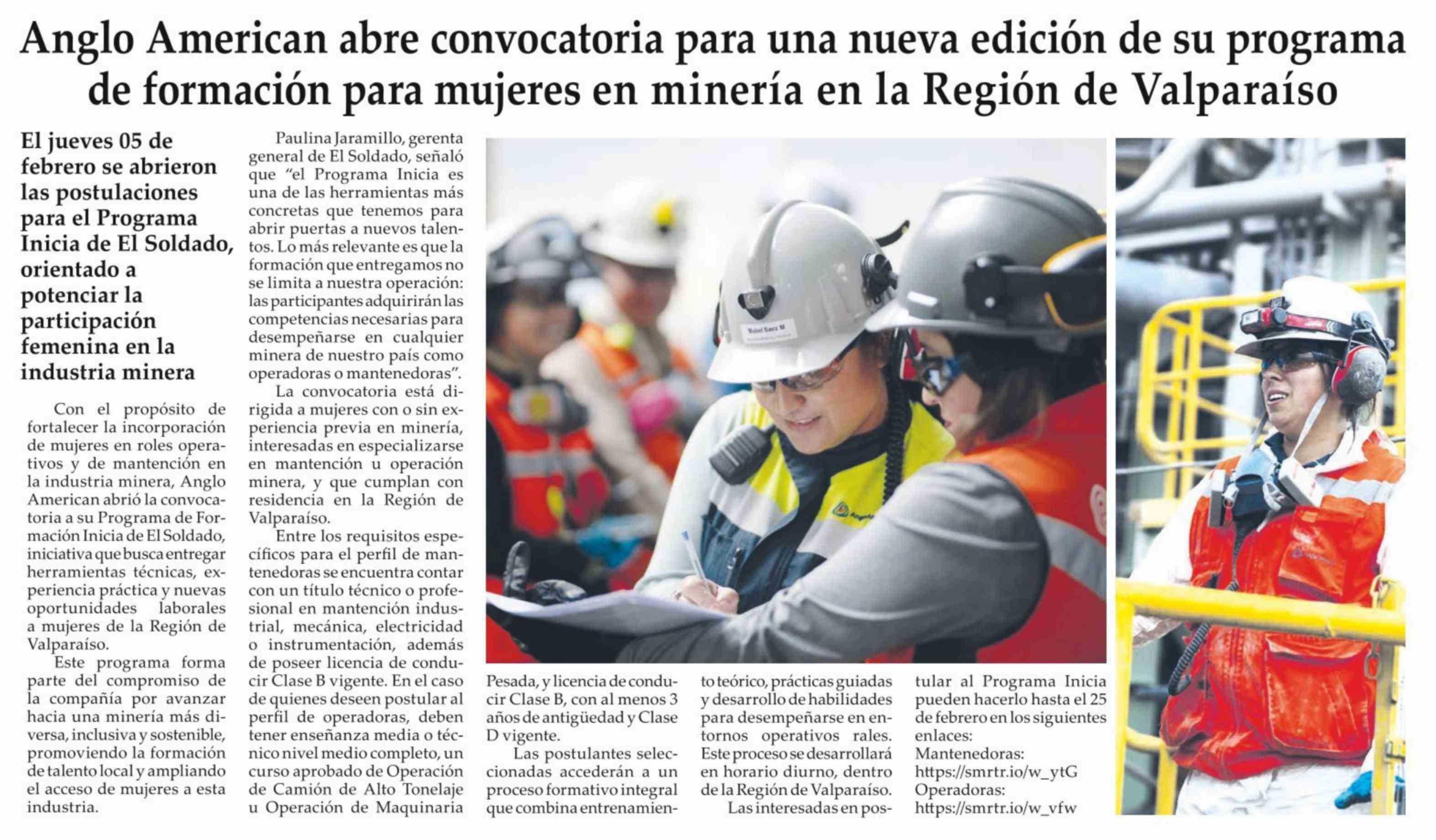 Título: Anglo American abre convocatoria para una nueva edición de su programa de formación para mujeres en minería en la Región de Valparaíso