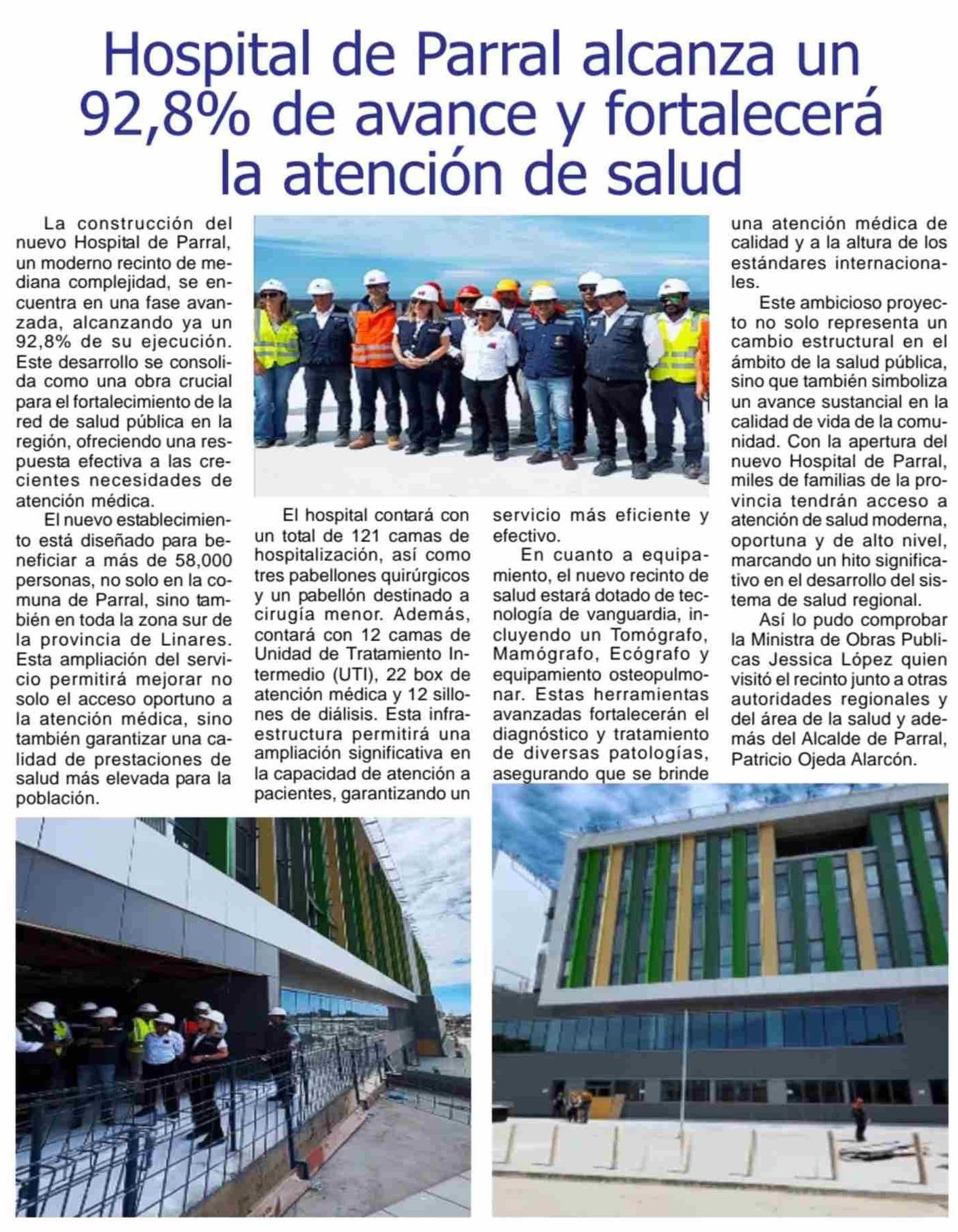 | Título: | Hospital de Parral alcanza un 92,8% de avance y fortalecerá la atención de salud |