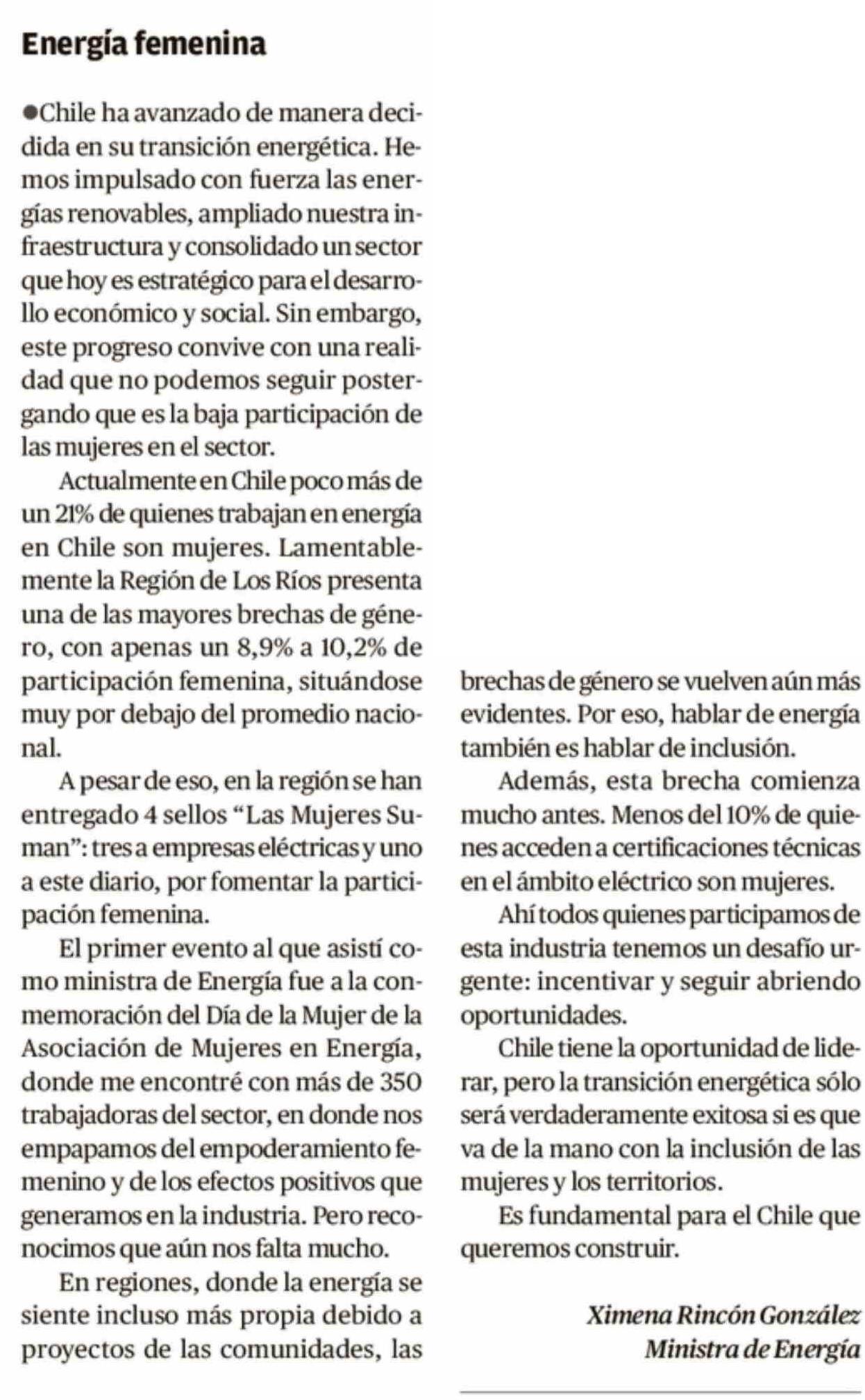 CARTAS: Energía femenina 29-03-2026 Diario Austral Región de Los Ríos |