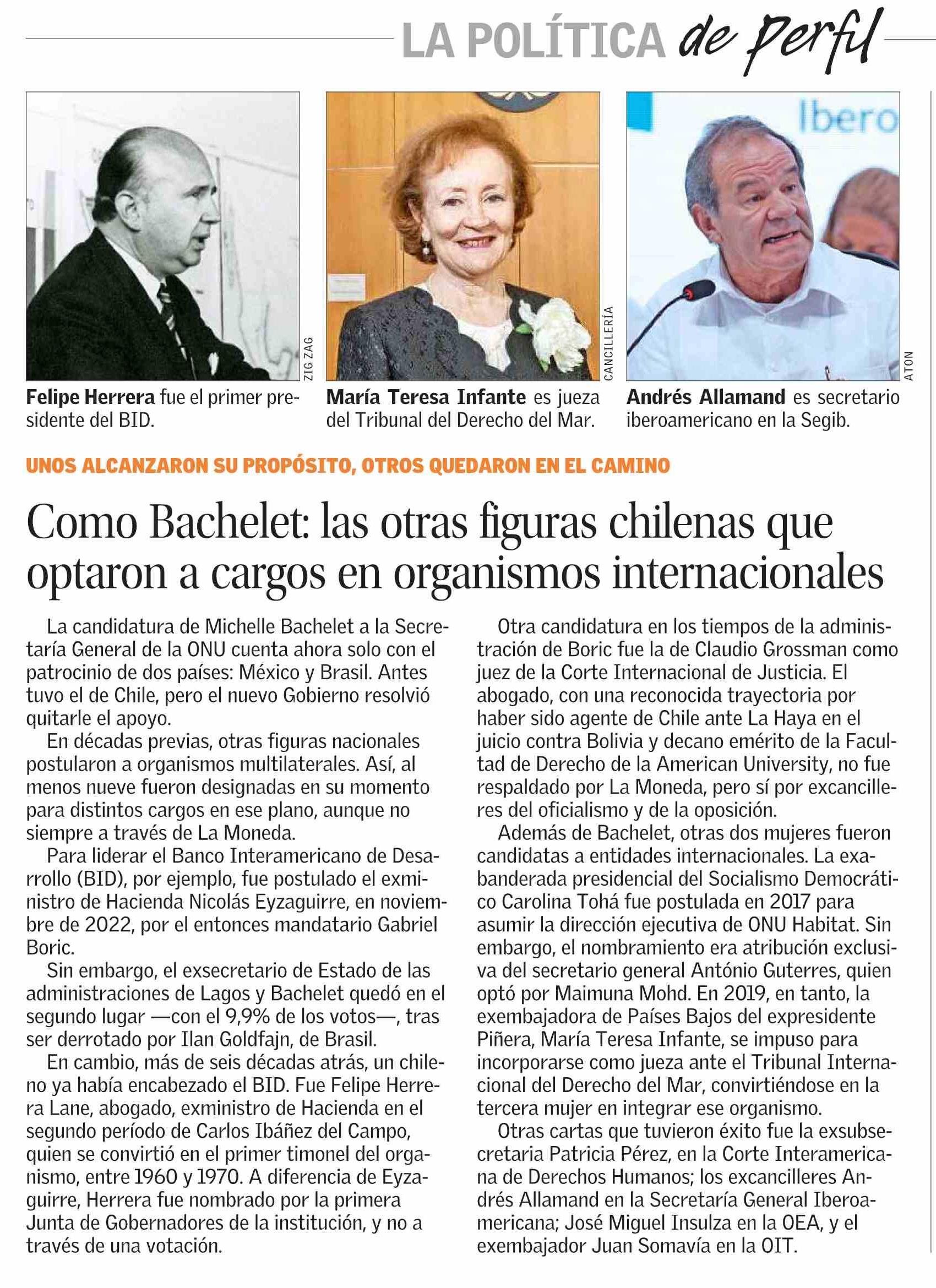 Como Bachelet: las otras figuras chilenas que optaron a cargos en organismos internacionales 30-03-2026 El Mercurio |