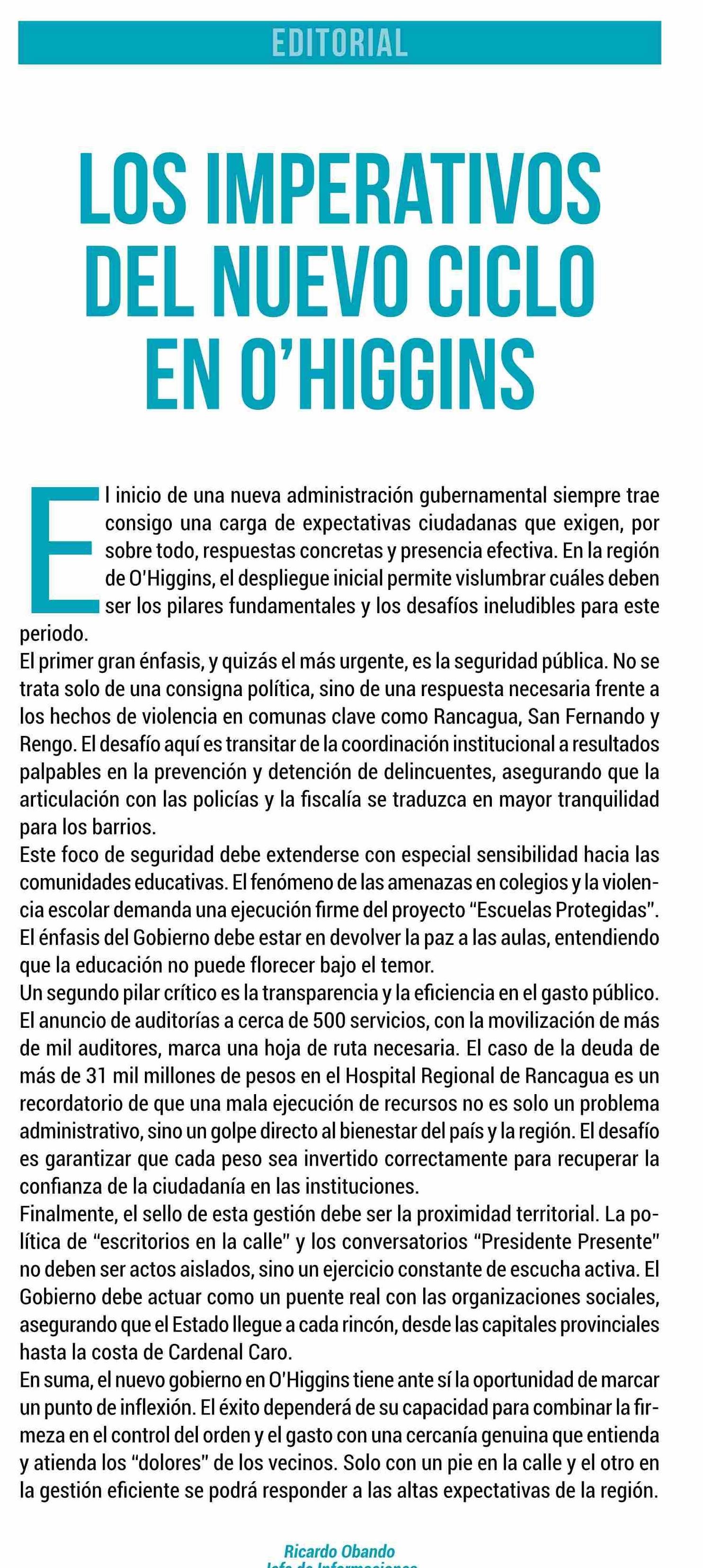 LOS IMPERATIVOS DEL NUEVO CICLO EN 0'HIGGINS 20-04-2026 El Rancagüino |