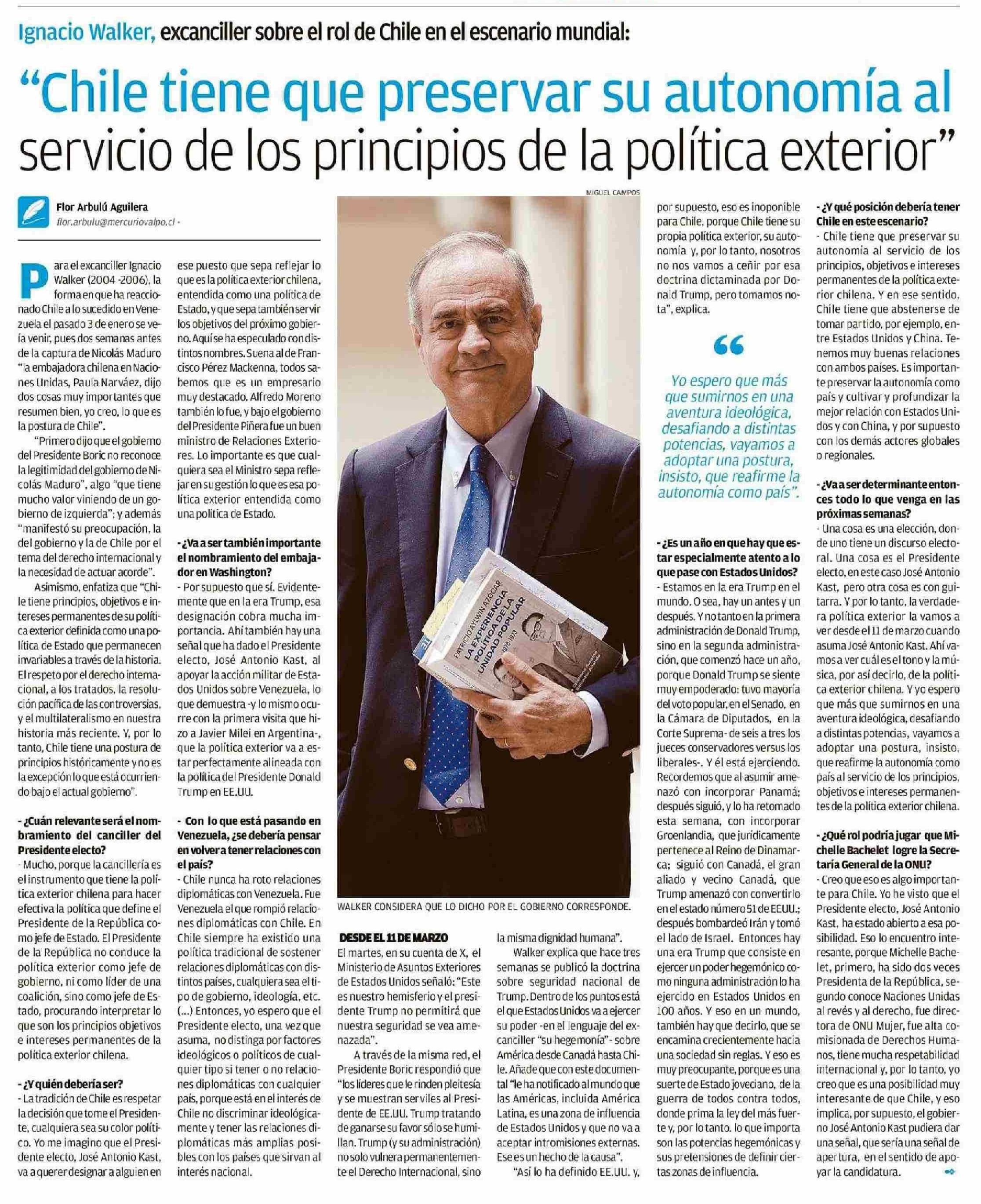 "Chile tiene que preservar su autonomía al servicio de los principios de la política exterior" 11-01-2026 El Mercurio de Valparaíso |