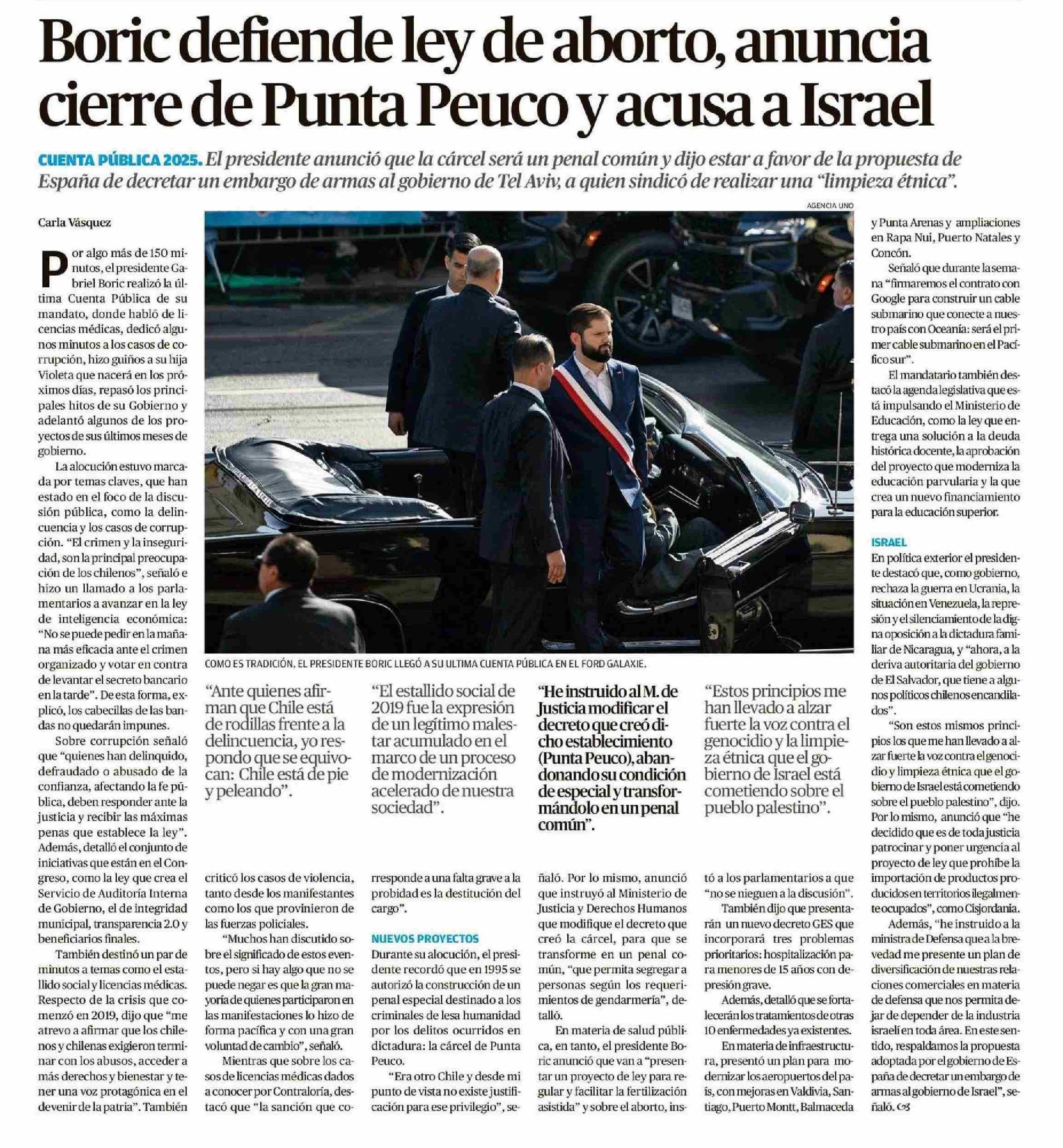 Título: Boric defiende ley de aborto, anuncia cierre de Punta Peuco y acusa a Israel