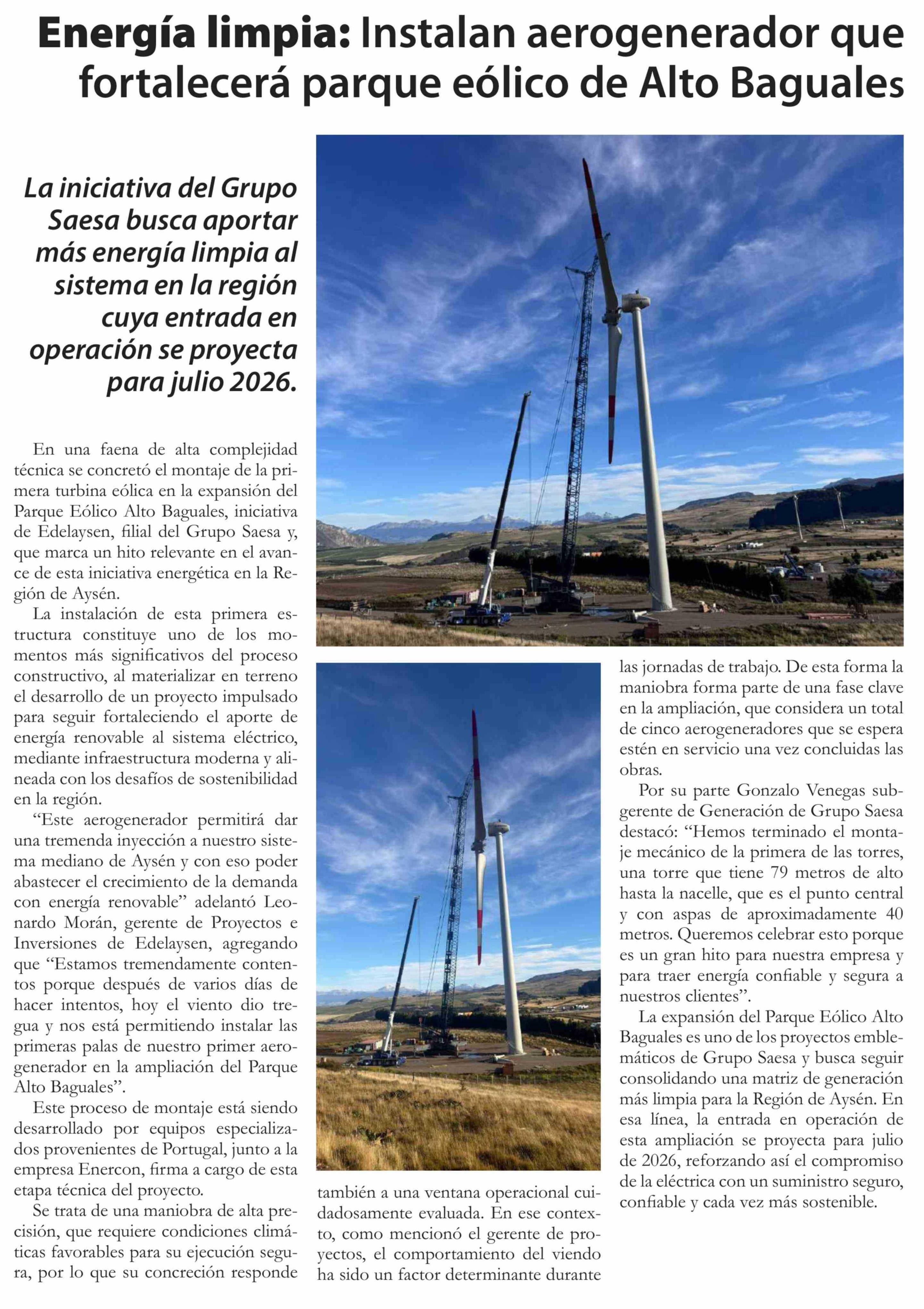 Título: Energía limpia: Instalan aerogenerador que fortalecerá parque eólico de Alto Baguales