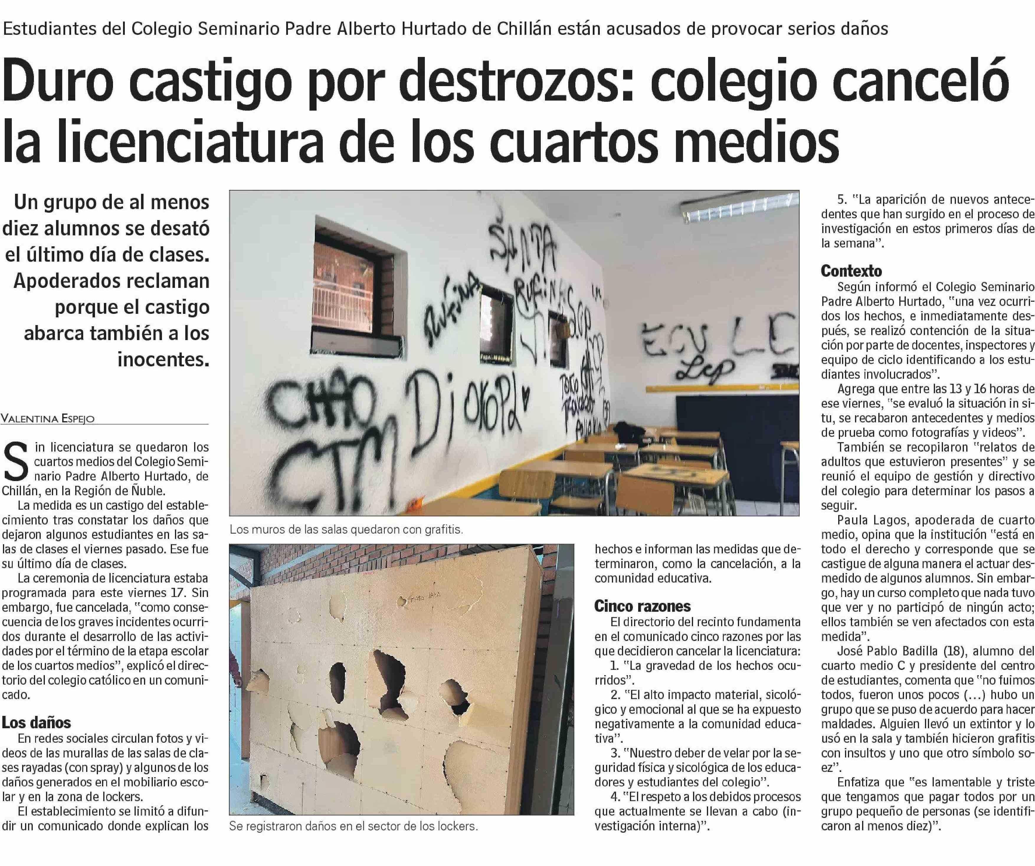Duro castigo por destrozos: colegio canceló la licenciatura de los cuartos medios 17-11-2023 Las Últimas Noticias |