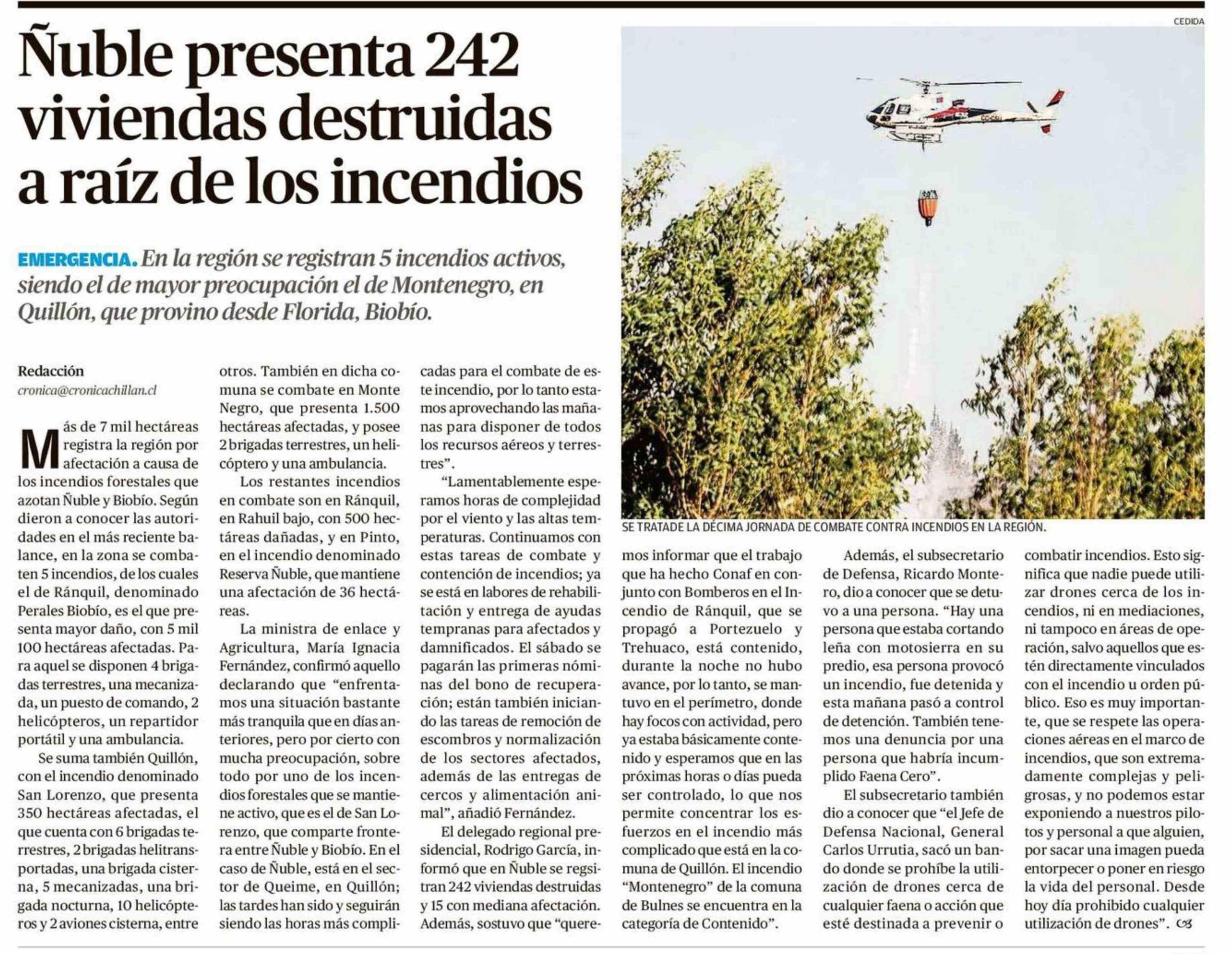 | Título: | Nuble presenta 242 viviendas destruidas a raíz de los incendios |