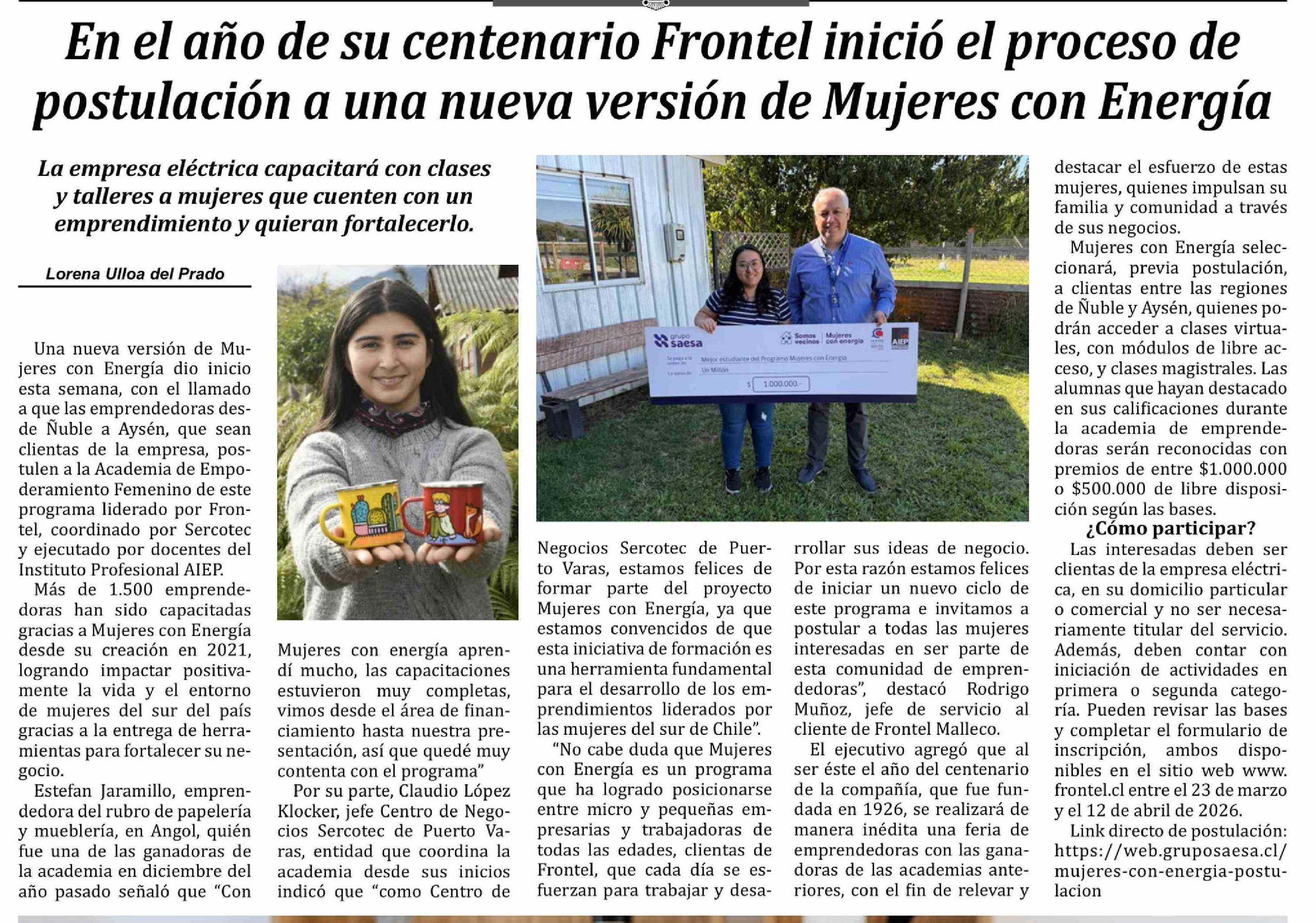 Título: En el año de su centenario Frontel inició el proceso de postulación a una nueva versión de Mujeres con Energía