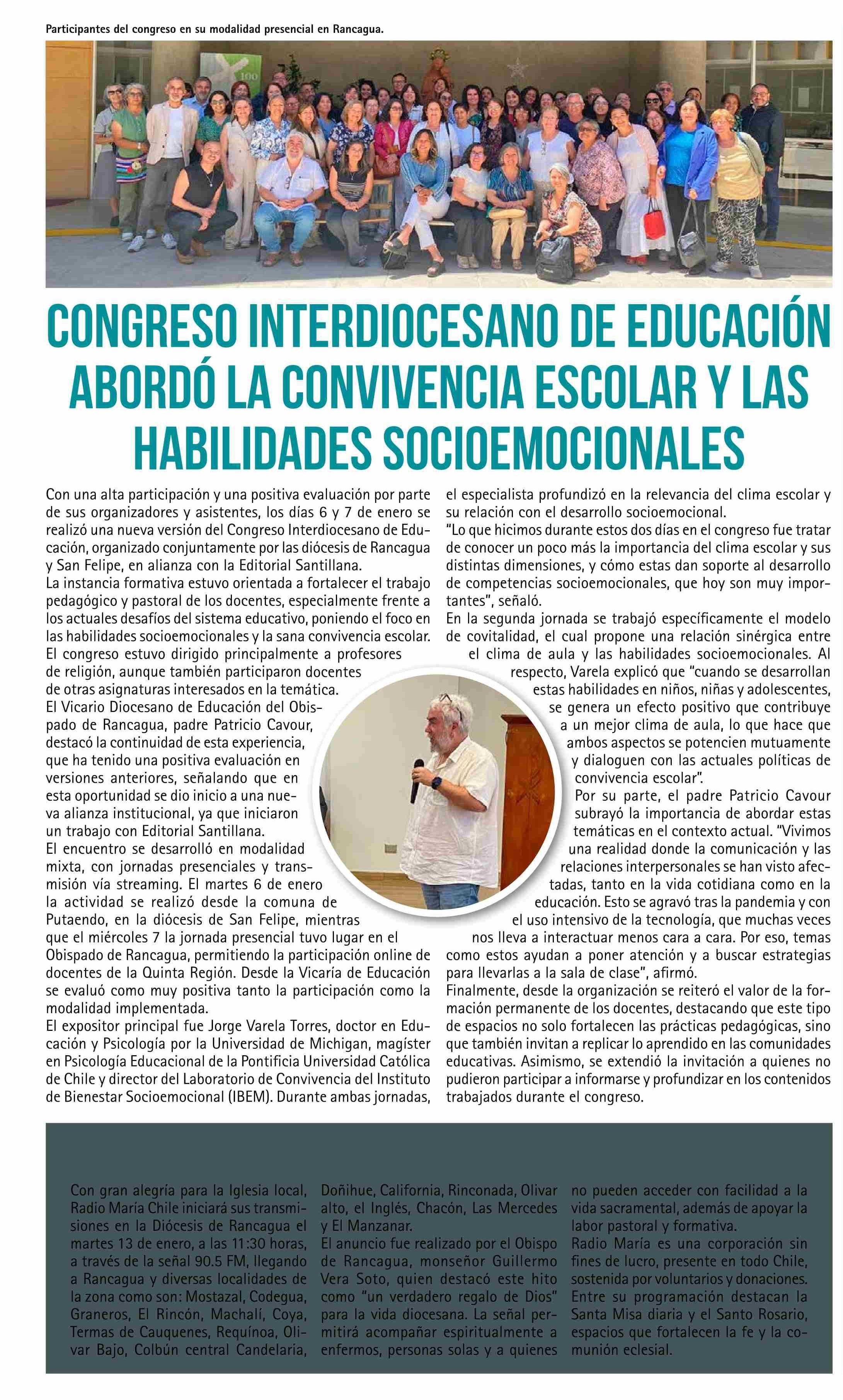 CONGRESO INTERDIOCESANO DE EDUCACIÓN ABORDÓ LA CONVIVENCIA ESCOLAR Y LAS HABILIDADES SOCIOEMOCIONALES 11-01-2026 El Rancagüino |